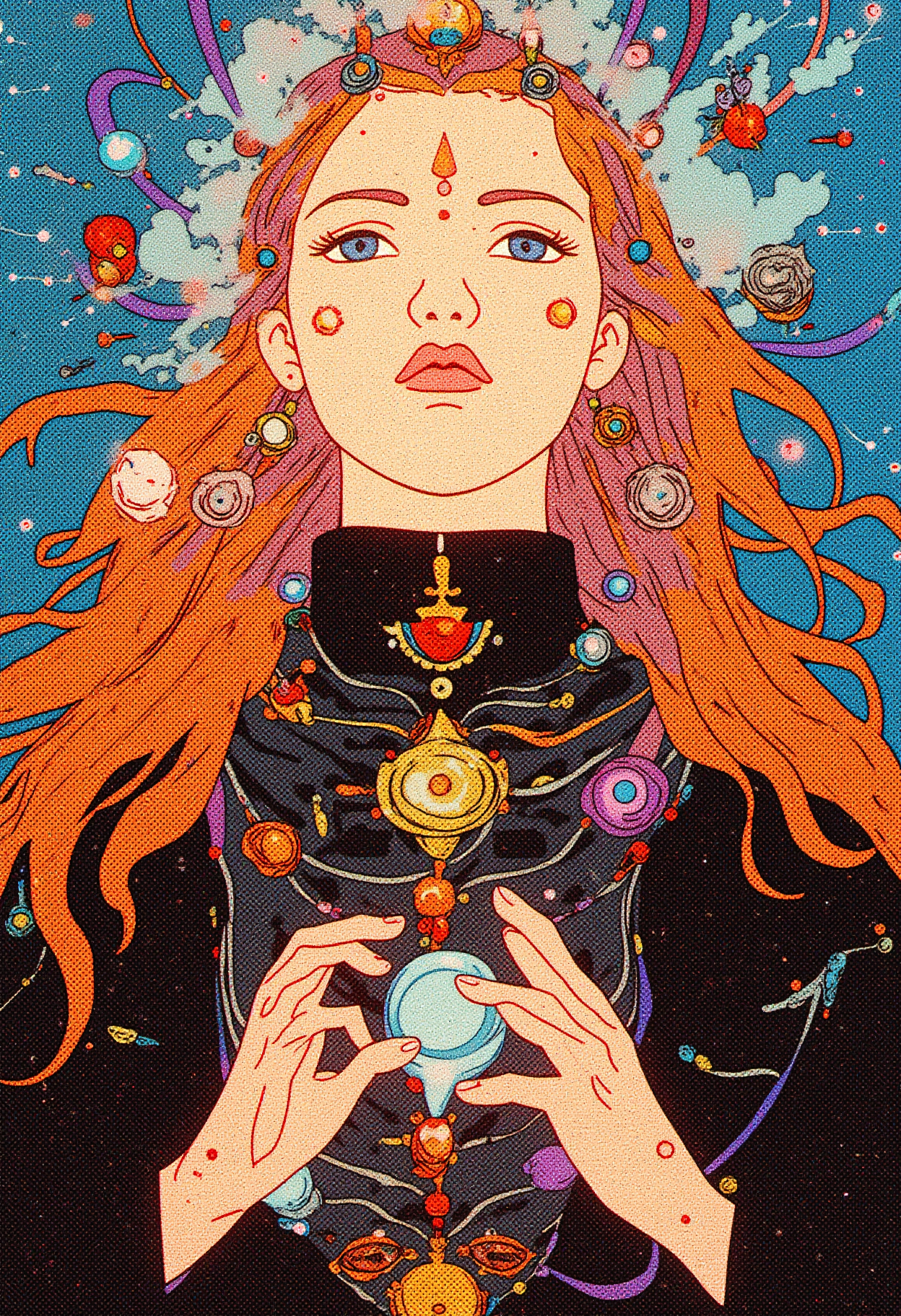A techno-shaman wearing a crystalline headdress that refracts reality/ quantum probability clouds swirling as ceremonial robes/ hands manipulating holographic ancient symbols/ cybernetic tribal markings pulsing with data streams/ floating technological totems orbiting their body/ in the style of Android Jones meets traditional Tibetan thangka art/ medium shot with dramatic side lighting/ kdny_body_flux
