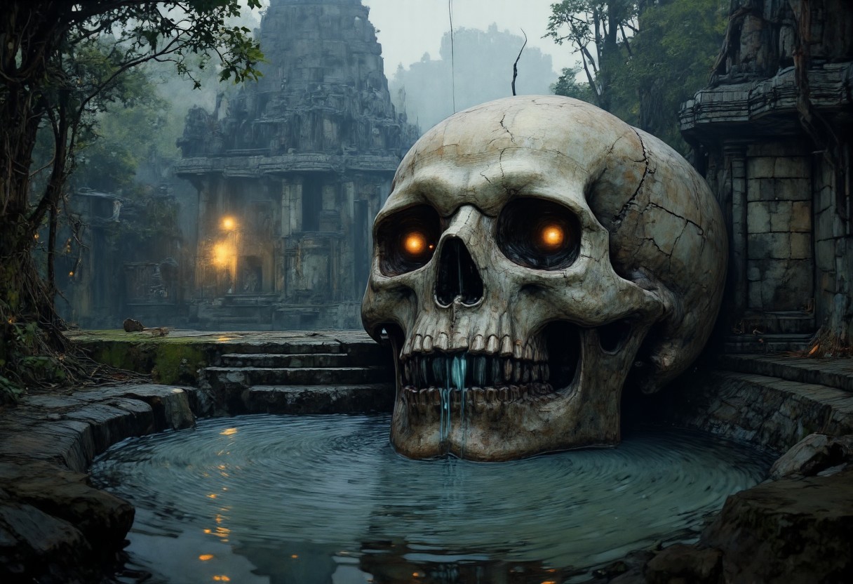 A colossal weathered stone skull, partially submerged in an ancient flooded ceremonial platform, its cavernous eyes streaming an unearthly, viscous liquid. The liquid glows faintly, an impossible mix of silver and black, rippling as it slowly rises, flooding the ruins. The skull’s structure is subtly alien—its cranial cavity unnaturally elongated, suggesting a being of vast intelligence, now long extinct. Cracks and eroded glyphs hint at a civilization lost to time. Towering behind the skull looms a massive, forgotten temple, its architecture otherworldly, adorned with intricate carvings of unknown origin. The temple is half-consumed by the overgrown Thai jungle, vines and roots failing to reclaim it as if afraid. The air is thick with mist and floating embers, caught in beams of golden light piercing through the dense jungle canopy. A sense of awe and unease permeates the scene—this is no mere artifact. This is a tomb of something ancient, something waiting. Composition: Cinematic wide shot, slightly low angle for grandeur Moody, diffused lighting with mist and volumetric rays High-detail 8K resolution, hyperrealistic textures Dramatic contrast between the glowing liquid and the dark, moss-covered stone Unreal Engine-style rendering with photorealistic depth