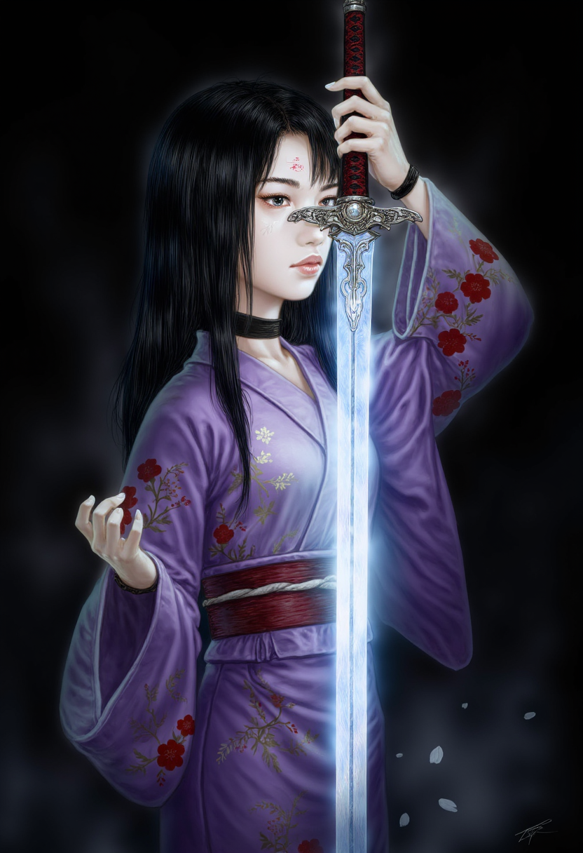 A digital artwork of an animated female character. She has long black hair, fair skin, and is holding a sword with blue energy emanating from its blade. The character is dressed in a traditional Japanese garment that resembles a kimono, adorned with floral patterns. She appears to be standing against a dark background, and there are subtle hints of petals around her, suggesting a theme related to cherry blossoms or nature's cycle of growth and death.