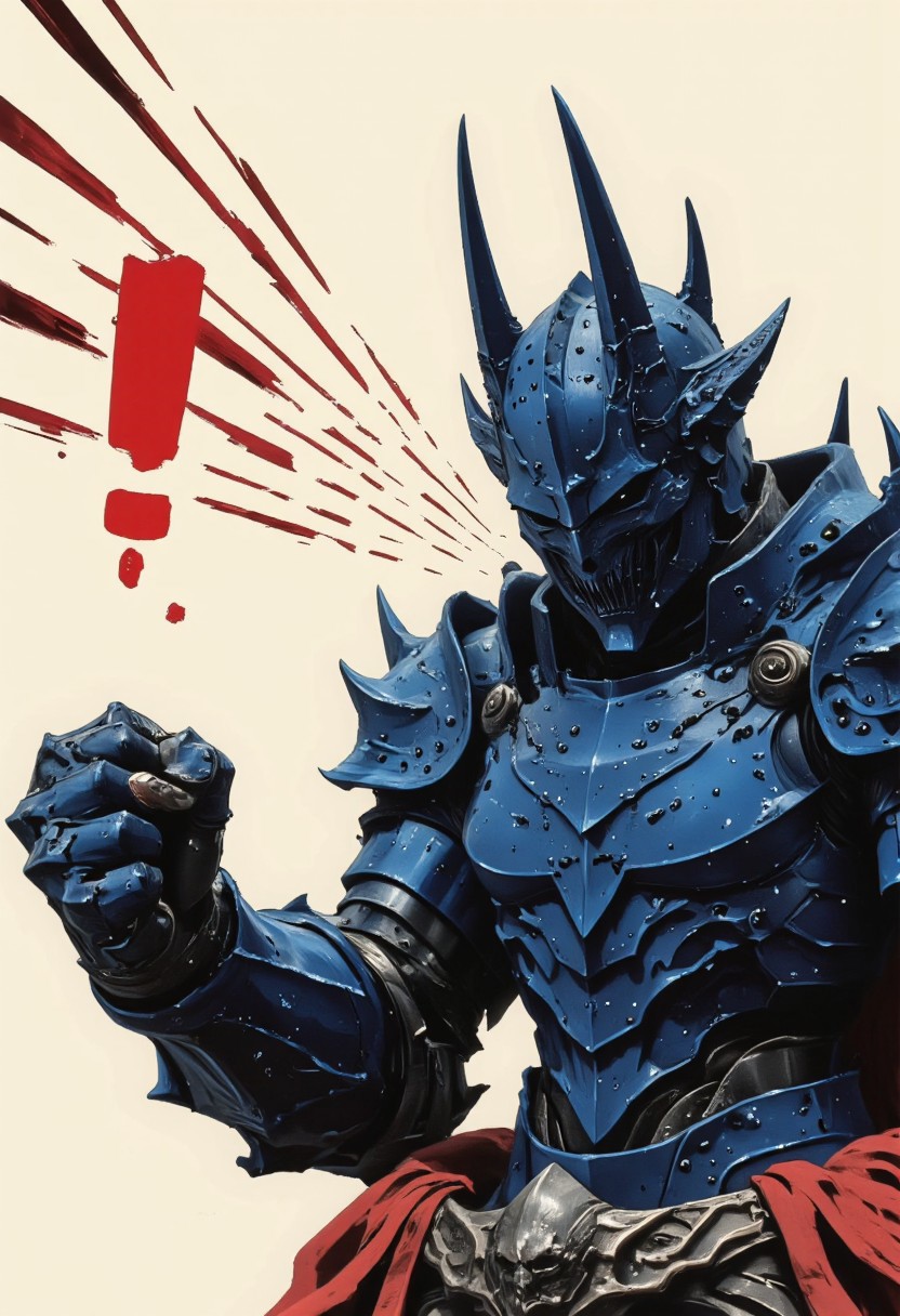 This is a digital drawing in a stylized, abstract art style, reminiscent of cyberpunk or sci-fi aesthetics. The scene features a dramatic Action scene. The figure is a massive, imposing mech or robot, depicted in shades of blue and dark blue, with jagged, angular lines and a complex, heavily armored body. The mech's upper body is particularly bulky, with a large, angular head and a noticeable exoskeleton-like structure. It holds a massive gun or cannon in its right arm, which extends outward, with multiple lines suggesting motion or energy discharges. An exclamation point in bright red is above the mech, emphasizing its action or alert. The background is a minimalist, off-white, which contrasts starkly with the dark colors of the mech and the figure, making them stand out prominently.