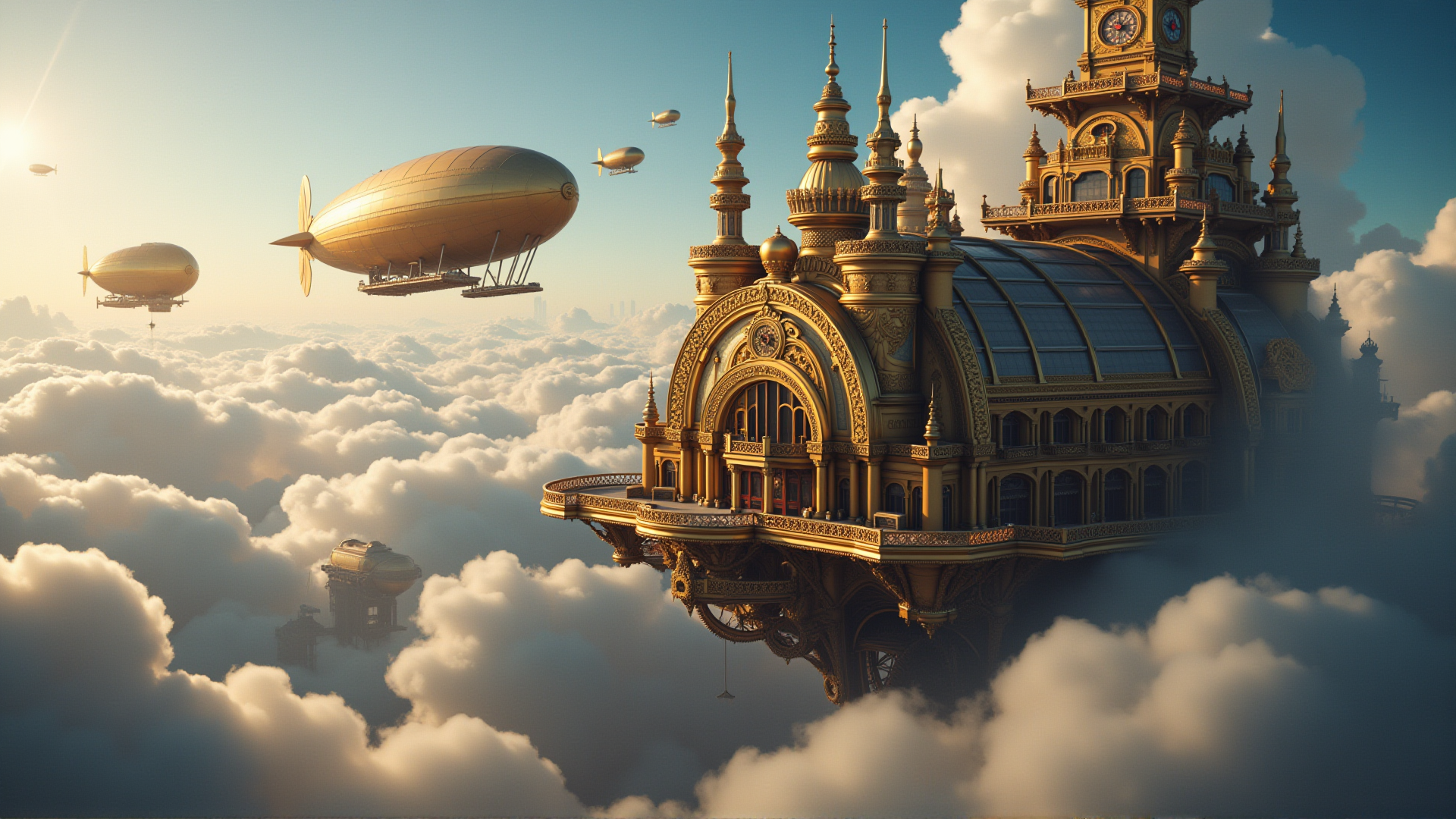 Step into an alternate reality where an airborne steampunk metropolis drifts gracefully among swirling clouds of steam and intricate, brass-bound gears. Elaborate dirigibles and ornately designed airships navigate the sky, their polished exteriors catching the light as they pass over a sprawling cityscape of mechanical gardens and clockwork towers. At the heart of this aerial realm, a grand opera house stands as a beacon of elegance and innovation, its façade a masterful blend of vintage filigree and modern holographic displays. The sound of mechanical whirring is harmonized with the ethereal strains of orchestral music, creating an atmosphere where every note and every cog tells a story of timeless creativity and boundless ingenuity.