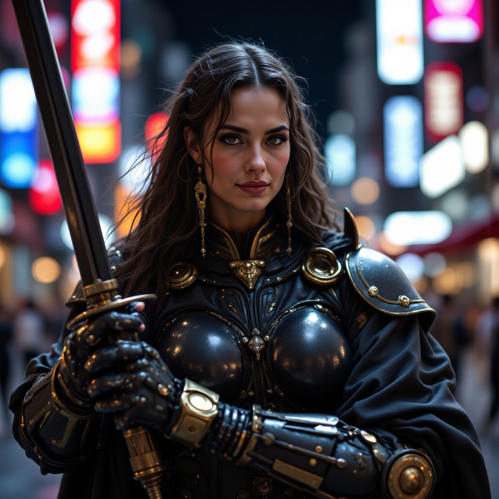 Realistic Photography, Very Low angle Ground Level camera view below looking up From a distance, Futuristic, Distant Vibrant Colors Full body Powerful Female Face Lucy Lawless, High detailed face, High detailed eyes, Xena Style Armor outfit, Vibrant Colors cyborg Powerful Female Xena Style Armor, Xena Armor Style Exosuit, Large Breasts, mech, Robot, Action Dynamic Action Combat Pose, futuristic, (off-center composition, left aligned, Portrait), an old Powerful cyborg, battle worn, Bulky Xena Style Power Armor, Large Sword, Happy high detailed Eyes, Happy Smile High detailed face, Science Ficton Gothic Neon Cyberpunk Cityscape, cinematic film still glamorous photo dark art by Rafael Zabaleta, expressionism art by Asger Jorn, vibrant, Abstract expressionism, experimental painting techniques, bold bright colors, dynamic compositions, Expressionism, Neon Night City Cyberpunk Cityscapes, emotive brushwork, brilliant tones, dramatic lighting, introspective themes. high fashion, luxurious, extravagant, stylish, sensual, opulent, elegance, stunning beauty, professional, high contrast, detailed. shallow depth of field, vignette, highly detailed, high budget, bokeh, cinemascope, moody, epic, gorgeous, film grain, grainy