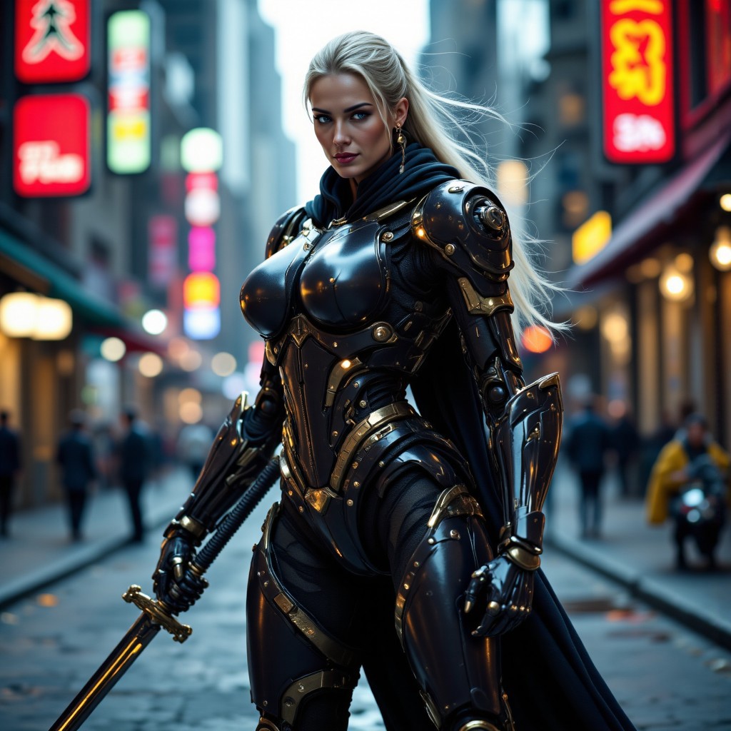 Realistic Photography, Very Low angle Ground Level camera view below looking up From a distance, Futuristic, Distant Vibrant Colors, Full body, Powerful Lucy Lawless Female Face, Highly detailed face, High detailed blue eyes, Xena Warrior Princess Style Armor outfit, Vibrant Colors cyborg Powerful Female Xena Style Armor, Xena Warrior Princess Armor Style Exosuit, Large Breasts, mech, Robot, Action Dynamic Action Combat Pose, futuristic, (off-center composition, left aligned, Portrait), an old Powerful cyborg, battle worn, Bulky Xena Style Power Armor, Large Sword, Happy high detailed Eyes, Happy Smile High detailed face, Science Fiction Gothic Neon Cyberpunk Cityscape, cinematic film still glamorous photo dark art by Rafael Zabaleta, expressionism art by Asger Jorn, vibrant, Abstract expressionism, experimental painting techniques, bold bright colors, dynamic compositions, Expressionism, Neon Night City Cyberpunk Cityscapes, emotive brushwork, brilliant tones, dramatic lighting, introspective themes. high fashion, luxurious, extravagant, stylish, sensual, opulent, elegance, stunning beauty, professional, high contrast, detailed. shallow depth of field, vignette, highly detailed, high budget, bokeh, cinemascope, moody, epic, gorgeous, film grain, grainy