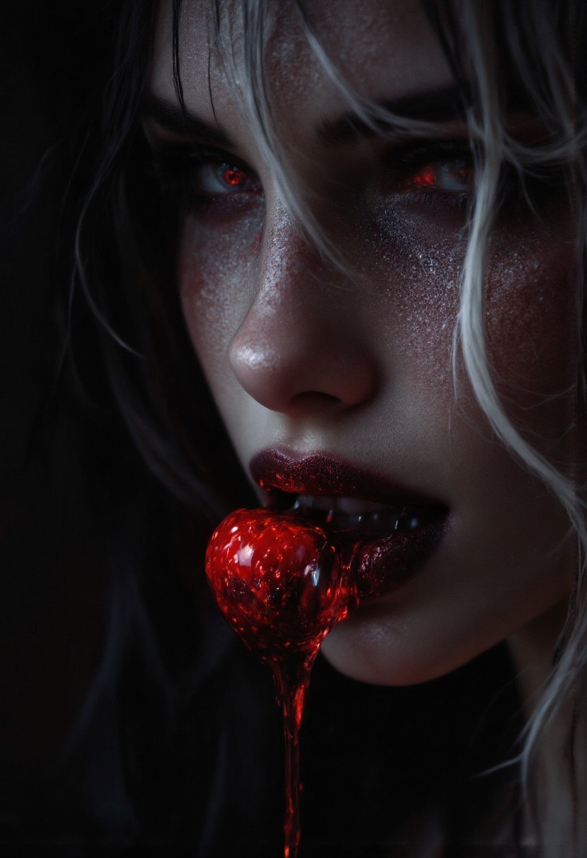 Masterpiece, high detail, extreme closeup portrait of a beautiful vampire woman with piercing red eyes. She has long silver hair, dark, smoky eyeshadow that enhances her piercing gaze, and blood-red lips slightly parted to reveal sharp fangs as she bites into a crimson strawberry dripping with blood. Her expression is seductive and erotic, drawing the viewer in with an intense, direct gaze. Her tongue is glistening wet with saliva The composition highlights her side profile, emphasizing the curve of her jaw, her cute nose and the delicate details of her features. The dark background contrasts with the luminous tones of her skin and hair, enhancing the blood droplets glistening on the strawberry. Hyperdetailed concept art with HD8K resolution, designed for a high-definition wallpaper. The atmosphere is alluring and mysterious, capturing her sensual and predatory essence. <lora:FluxF4ngs:0.85> fangs <lora:aidmaFLUXpro1.1light-FLUX-V0.1:1> aidmafluxpro1.1 <lora:fluxenhancer:0.25>