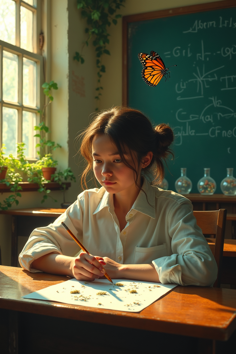 Golden afternoon light slants through dusty classroom windows, casting long shadows over rows of wooden desks. The young woman sits rigidly, her pencil trembling above an exam paper where inkblots bloom into microscopic organisms. Behind her, the teacher’s chalkboard is overgrown with ivy, equations dissolving into root systems. Petri dishes on nearby shelves pulse faintly, their glowing cultures humming in sync with her racing heartbeat. A monarch butterfly—wings patterned like cell membranes—flutters past her ear, echoing her urge to escape. Style: Magical realism fused with vintage scientific illustrations, muted earth tones contrasted with bioluminescent teal.