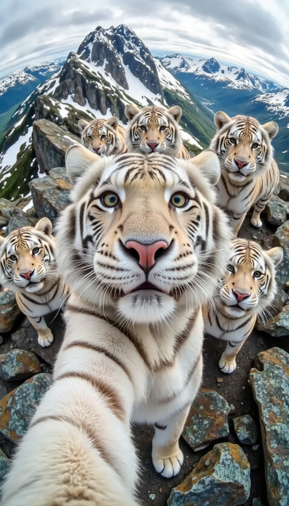RAW photo, a group of adult white tigers taking a selfie on top of a snowy mountain, with sharp jagged rocks and thick layers of snow visible everywhere, overcast clouds looming above them, creating a diffused light, proud and playful expressions, detailed fur glistening with moisture, 8k uhd, dslr, cinematic depth of field, photorealistic