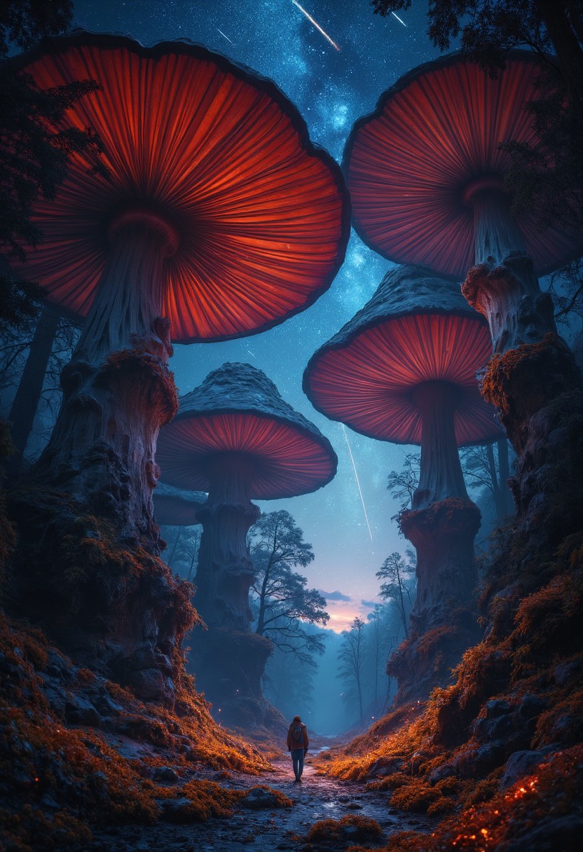A majestic nighttime fantasy landscape where enormous mushrooms frame a spectacular view of the star-filled sky above. The caps of the giant mushrooms are silhouetted against a rich tapestry of stars, with the Milky Way clearly visible stretching across the canopy gaps. The mushrooms maintain their massive scale and red coloration but are now dramatically lit from below by subtle bioluminescent undergrowth, creating a perfect balance between their earthy presence and the celestial display above. A lone adventurer walks a path that winds between the towering mushroom stems, their way lit by scattered patches of glowing moss and small luminescent fungi. The starlight filters through gaps between the mushroom caps, creating subtle light plays in the misty air. Shooting stars occasionally streak across visible patches of sky, adding dynamic elements to the celestial canvas. The forest floor retains its autumn colors but is now transformed by the interplay of starlight and bioluminescence. The composition carefully frames the star-filled sky between mushroom caps while maintaining the sense of scale that makes the scene so impactful. The lighting balances the bright starry sky with the more subtle terrestrial illumination, creating a harmony between the earthly and celestial elements.