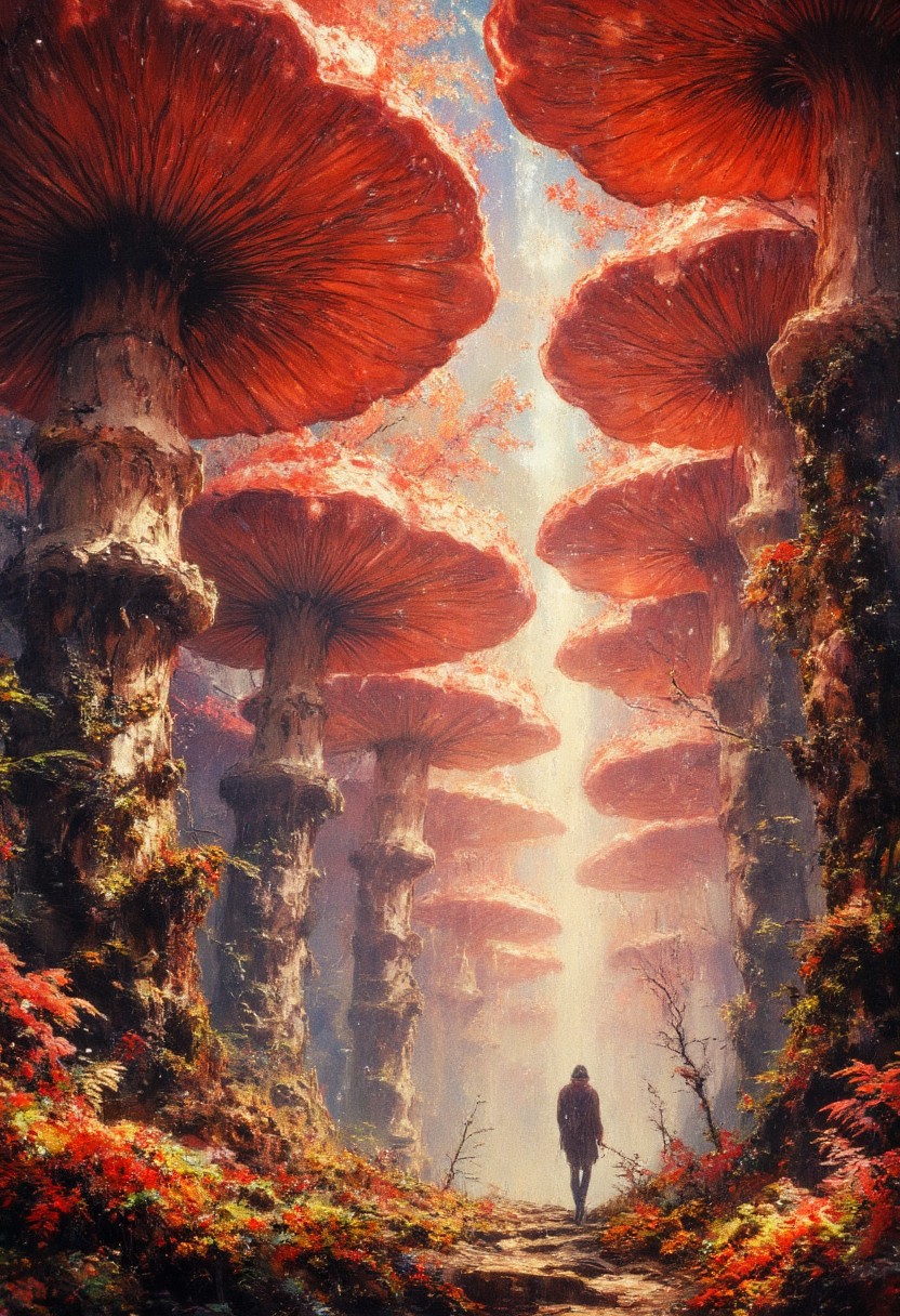 An awe-inspiring fantasy landscape captured from a dramatic low angle perspective, looking upward at towering red mushrooms that dominate the frame like natural skyscrapers. The mushroom caps spread across the upper portion of the image like massive umbrellas, their undersides detailed with intricate gill patterns and subtle variations in their rich red coloration. Sunlight filters through the gaps between the mushroom caps, creating spectacular light rays that pierce through the misty air and illuminate floating spores and dust particles. The mushroom stems rise majestically from the foreground, their texture rendered in photorealistic detail with rough, organic patterns and subtle color variations. A lone adventurer, shown in silhouette against the bright canopy above, walks along a path that winds between the massive stems, their small scale emphasizing the colossal size of the mushrooms. The forest floor in the foreground features rich autumn foliage and moss, with fallen leaves and small plants rendered in intimate detail. The atmosphere maintains a dreamy, magical quality with a gentle mist that softens edges without obscuring detail. The composition should follow the rule of thirds with the mushroom stems creating strong vertical lines that draw the eye upward. The lighting is warm and golden, creating a corona effect around the mushroom caps when backlighting them.