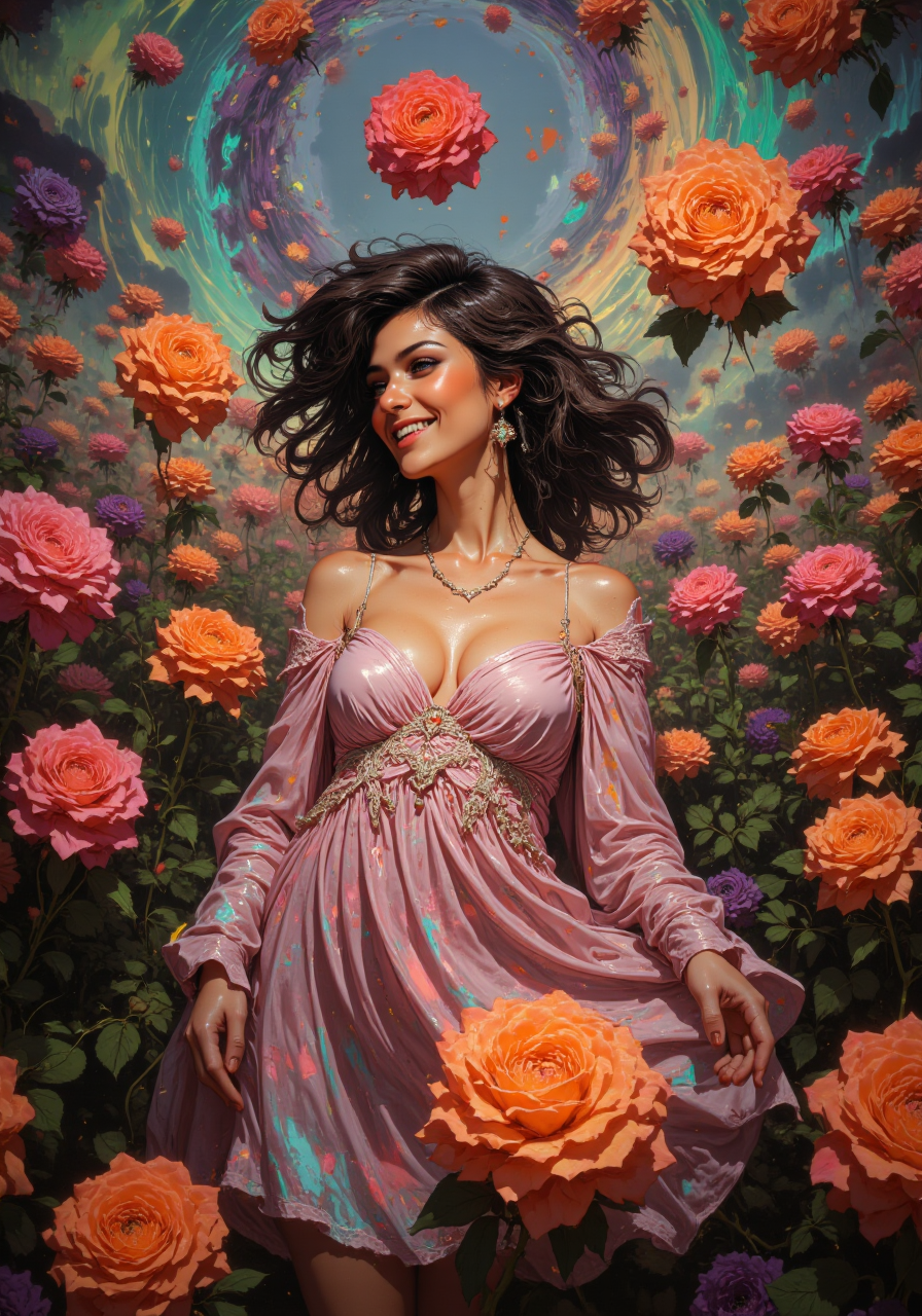 A whirlwind of vibrant, swirling colors fills the air as dozens of multicolored rosebuds dance in a chaotic, yet mesmerizing vortex. Each rose is a burst of saturated hues—electric pinks, fiery oranges, deep purples, and neon greens—their petals glowing as if lit from within. The roses spin and twirl, creating a kaleidoscope of light and movement, their delicate forms defying gravity as they float and swirl in perfect harmony. At the center of this magical storm is a young black woman, her expression a mix of awe and exhilaration. Her dark skin glistens under the radiant light of the roses, and her curly hair flows around her like a halo, caught in the same whirlwind. She wears a flowing, ethereal dress that seems to be made of the same colorful energy as the roses, its fabric shimmering and shifting with every movement. The roses carry her gently, lifting her off the ground as if she’s weightless. Her arms are outstretched, and her eyes are closed, a serene smile playing on her lips as she surrenders to the beauty of the moment. The background is a blur of swirling colors and light, as if the entire world has dissolved into this magical, rose-filled vortex. The scene is a celebration of freedom, beauty, and the power of nature’s artistry. The woman and the roses seem to be one, united in a dance of color and motion that feels both fleeting and eternal. It’s a moment of pure, unbridled joy, captured in a burst of vivid, surreal imagery."