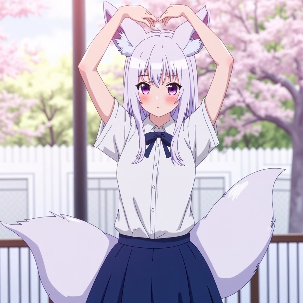 <lora:Modern_Anime_Style:1>, anime, armheart, A fox girl in a japanese school outfit with her doing an armheart pose while looking at the viewer. The girl should have white hair that matches her fox ears and fox tail. The eyes are a deep purple. Her skirt should be a dark blue color that compliments the purple in her eyes. Make sure the hands are anatomically correct