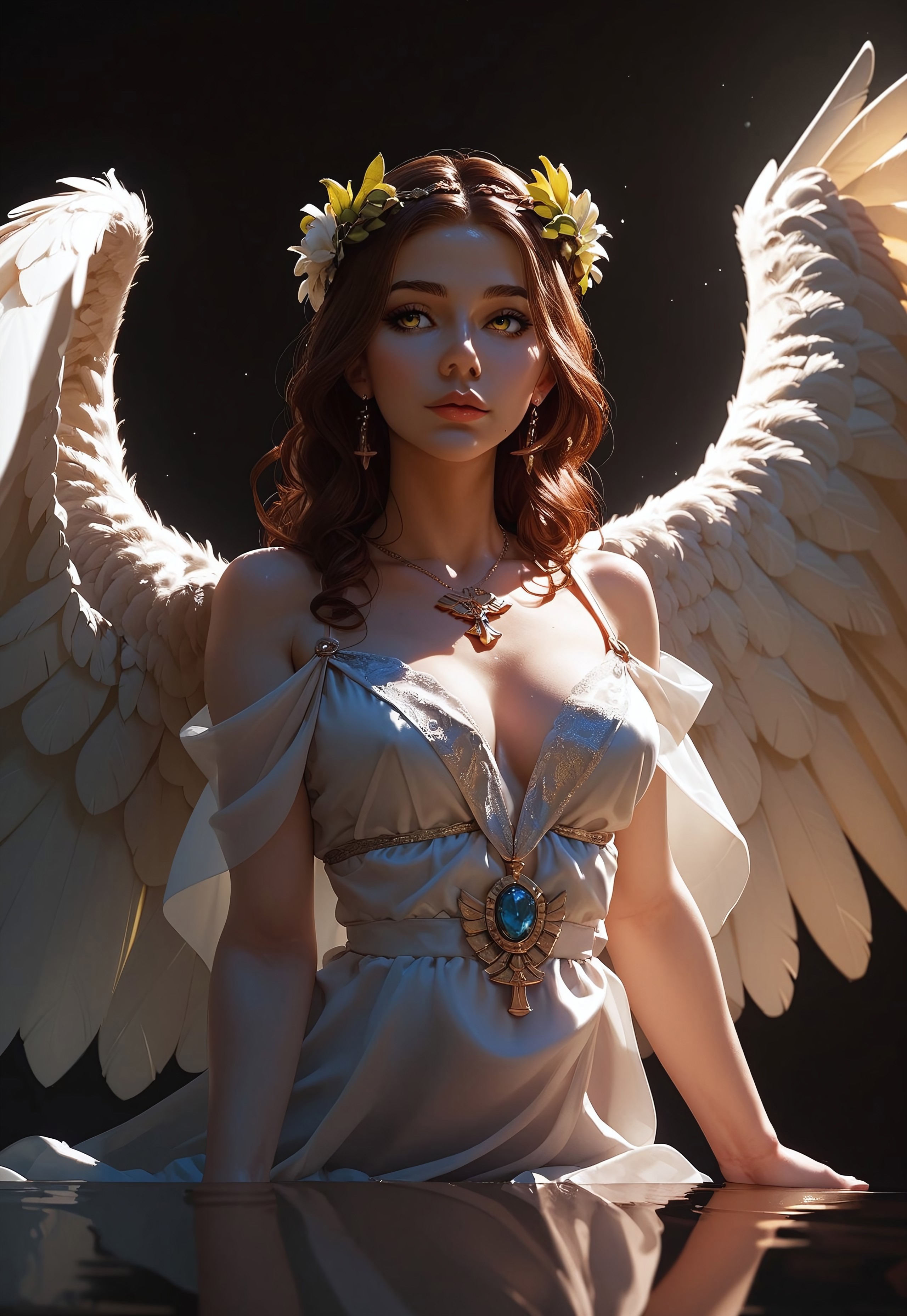 Masterpiece, score_9, score_8_up, score_7_up, score_6_up, Expressiveh, dark lighting, 1girl, (25 years old, elegant noble face, Greek, long curly brown hair, golden eyes, Ancient Greek robes, big wings with white feathers), holding laurel wreath, walking into steaming pool, looking over shoulder, dramatic lighting, dark background