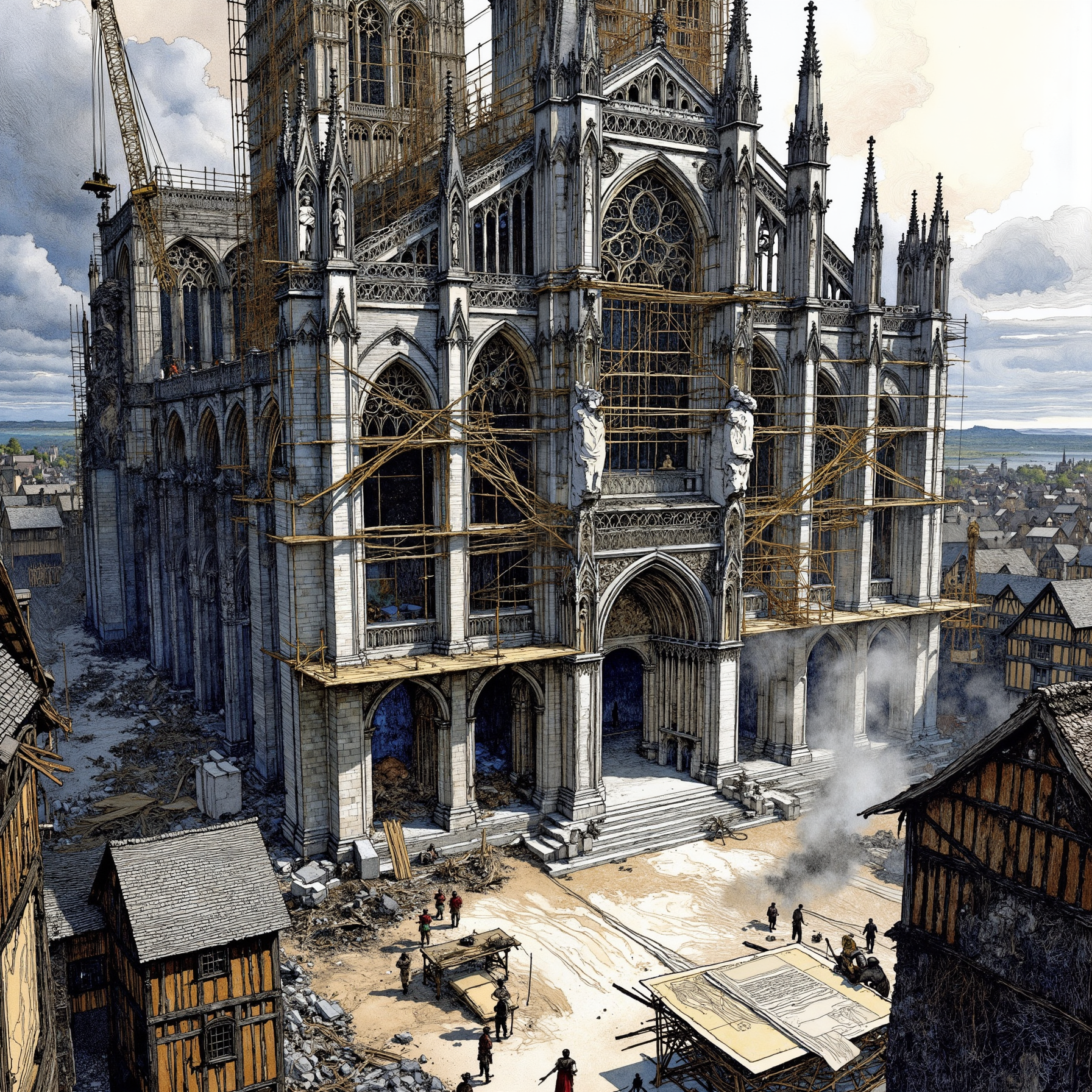 This is a digital artwork created in a mixed media style, blending elements of watercolor and ink. A high angle view of a bustling construction site for a grand Gothic cathedral, situated in the heart of a medieval city. The unfinished cathedral rises majestically, with towering stone walls, pointed arches, and partially completed spires covered in scaffolding made of wooden beams. Cranes powered by pulleys and ropes lift massive blocks of stone into place, while intricate carvings and gargoyles begin to take shape on the facades. The site is alive with activity. Stonemasons meticulously carve blocks of limestone, creating delicate tracery and statues. Carpenters work on wooden scaffolding and frames, while blacksmiths forge tools and nails at makeshift forges nearby. Laborers haul materials, mix mortar, and assemble the intricate lattice of scaffolding that envelops the structure. Amid the workers, architects and overseers, dressed in finer medieval garb, discuss plans and study large parchment drawings spread out on wooden tables. Surrounding the site, the medieval city thrives with activity. Timber-framed houses with steep roofs and narrow alleys enclose the square, and townsfolk pause to watch the monumental construction. Dust rises from the ground, and the noise of hammers striking stone and the murmur of voices fills the air. The lighting is dark and diffused, suggesting an overcast day, adding to the sense of grandeur and ambition as this awe-inspiring Gothic structure slowly takes form in the heart of the bustling medieval world.