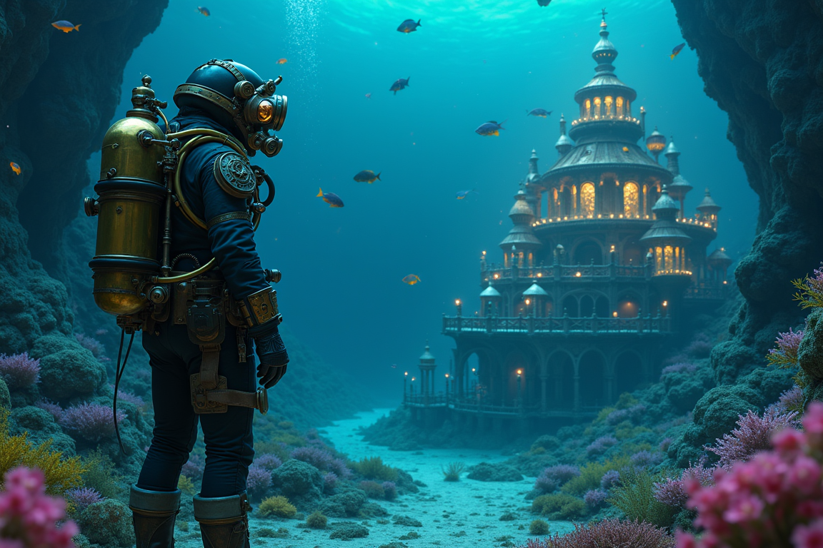 A deep-sea diver in ornate, steampunk-inspired gear pauses at the edge of a hidden underwater city. The city glows with an ethereal, bioluminescent light, a stark contrast to the dark ocean depths. Schools of exotic, glowing fish swirl around the diver, their scales shimmering with vibrant colors. Ancient, barnacle-encrusted artifacts litter the seabed. The diver's oxygen gauge is visibly low. The scene blends the intricate, mechanical details of steampunk with the whimsical, detailed artistry of a Studio Ghibli film
