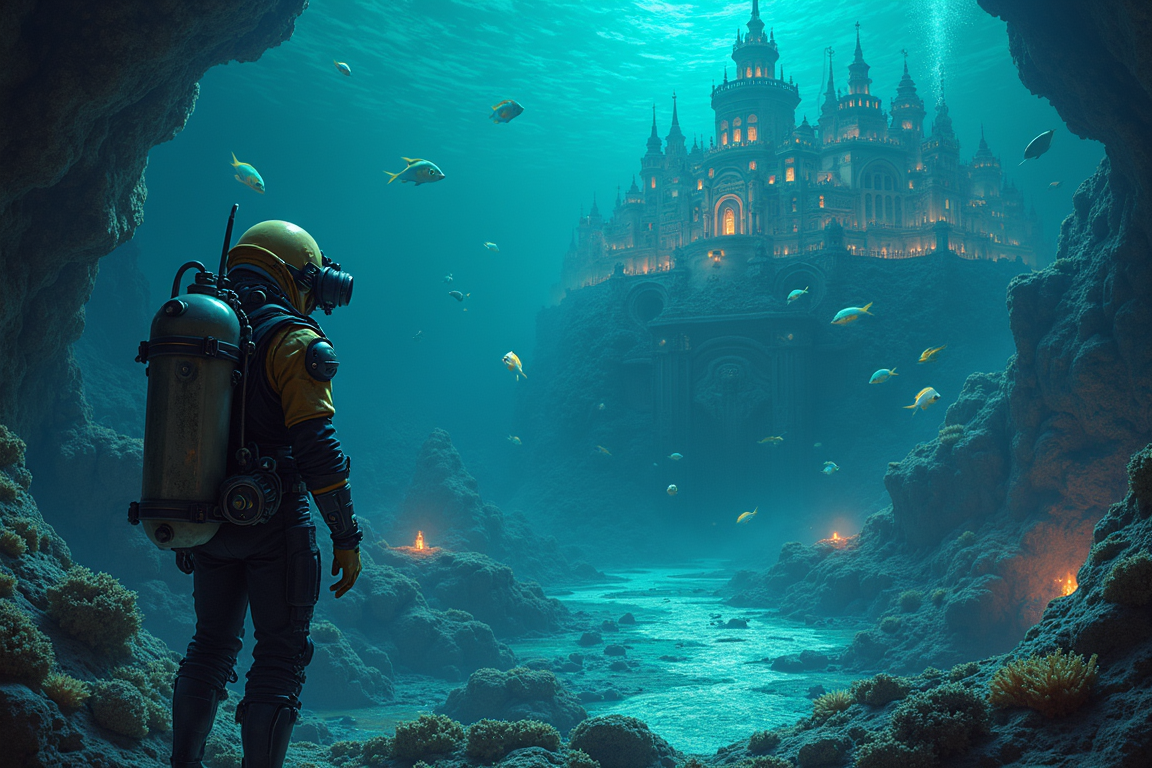 A deep-sea diver in ornate, steampunk-inspired gear pauses at the edge of a hidden underwater city. The city glows with an ethereal, bioluminescent light, a stark contrast to the dark ocean depths. Schools of exotic, glowing fish swirl around the diver, their scales shimmering with vibrant colors. Ancient, barnacle-encrusted artifacts litter the seabed. The diver's oxygen gauge is visibly low. The scene blends the intricate, mechanical details of steampunk with the whimsical, detailed artistry of a Studio Ghibli film