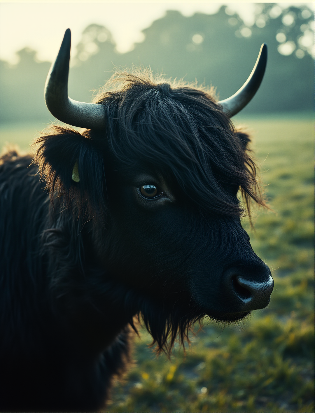 Side view portrait, Cow with long Black hair wig, windy day, magnificent, deep shadows, great composition, detail, high resolution, low saturation, pale, muted colors, atmosphere, high detail, mythological day, ancient atmosphere, unparalleled splendor, magnificent, amazing beauty, sparkling diamond, black emerald, <lora:Fantastic_Pic-v1.05:0.8>, real,(realistic),photo realistic, photography,highly detailed,(masterpiece),(high quality),best quality,super detailed,full detail,4k,8k,realistic lighting, norender, no anime