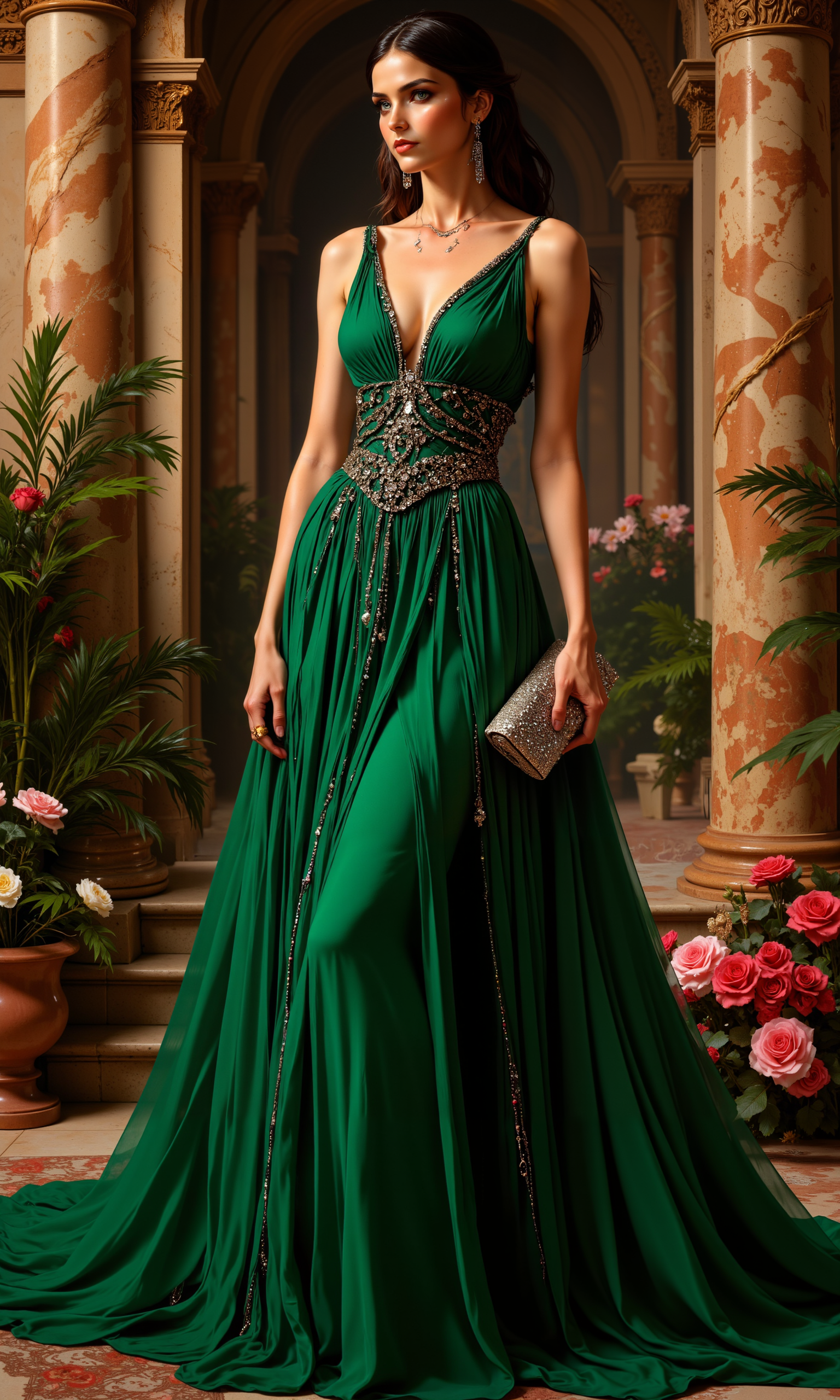 Opulent silk organza flowing gown, radiant hue of emerald green, intricate beaded embroidery cascading down the bodice, tailored waistline accentuating svelte figure, ethereal train floating effortlessly. Model poised in regal stance, delicate hand resting on a glittering diamond-encrusted clutch. Chandelier earrings whisper elegance, while sleek, slicked-back hairstyle emphasizes sultry, smoky eye makeup. High-fashion editorial lighting casts soft, golden highlights, imbuing an aura of sophistication and grandeur. Romantic backdrop, intricately carved marble columns and lush florals, echoing a timeless, majestic elegance. Maximum quality, 8K resolution, intricate detailing, masterful precision, artful composition capturing haute couture grandeur and exquisite craftsmanship. <lora:FluxFantasyDetailerV2:0.8> <lora:NeonFantasyPrimeFLUX-000049:0.3> <lora:RetroAnimeFluxV1:0.4> <lora:Hand v2:0.5>