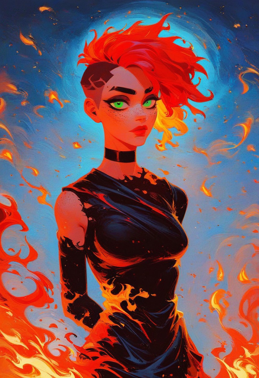 score_9, score_8_up, score_7_up, masterpiece, minimalist, novuschroma04 style, ((front view)), (1girl, clothing burning away, choker, short red hair, undercut, vibrant red hair framing her face, freckles, green eyes, large and expressive eyes, medium breasts), emerging from a raging fire, walking out of fire, (walking toward viewer), fire, flames, fire and flames in background, flames wrapping around her body, backlit, back lighting, harsh shadows, hard shadows, goth girl, goth, Minimalism, Greyscale, Stylized, revealing clothes, wet, steaming body, glowing clothes, burning clothes,