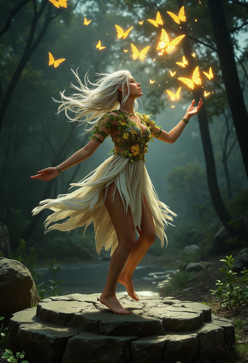 A wild fae sorceress, her body wrapped in a dress woven from glowing vines and enchanted blossoms, dances atop an ancient stone circle. Her long, iridescent hair shimmers like liquid silver as she twirls, her bare feet hovering just above the ground. She raises her hands, and golden butterflies, each carrying a spark of raw magic, explode outward, filling the darkened forest with radiant life. ,aidmabaldursgate3, aidmamj6.1,