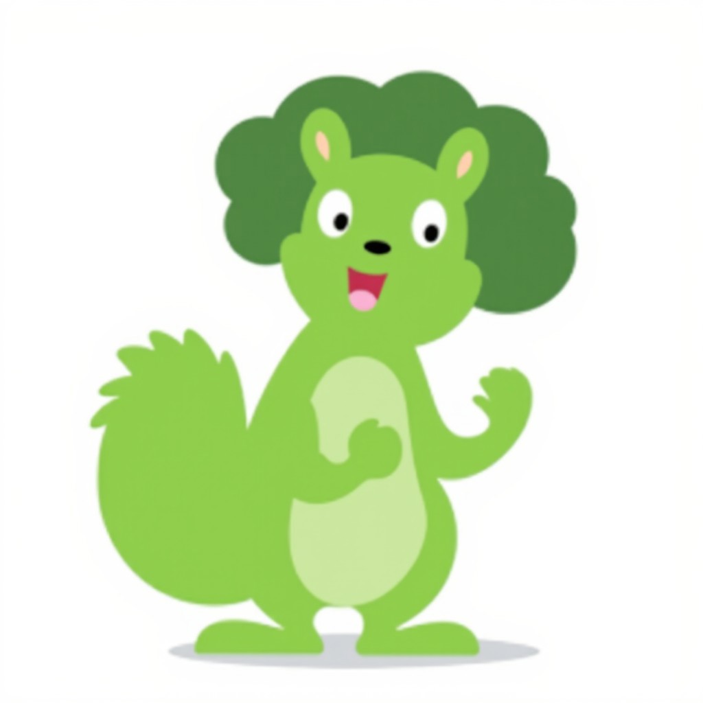 A green squirrel with a broccoli-haircut, funny, cute, cartoon-style, on white background