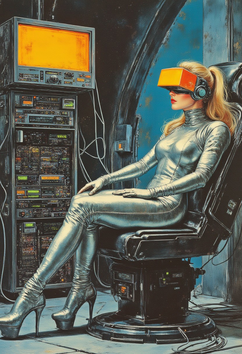 (sci fi horror) 80s vintage pulp sci-fi magazine cover of a woman wearing an orange visor with wires that go into a large mainframe and a futuristic silver bodysuit. Sitting in a large mechanical chair in front of a large screen