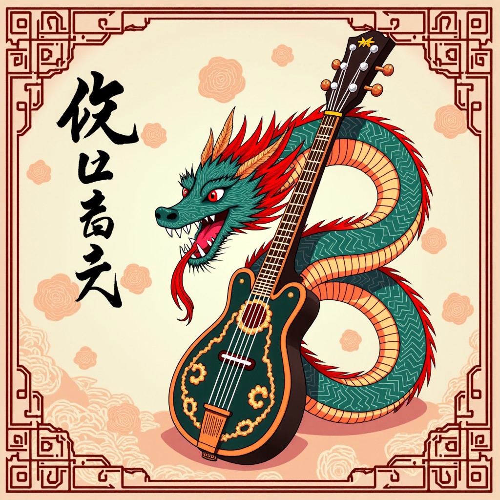 and its eyes are glowing, a majestic, forked tongue hangs out., featuring a stylized dragon. The dragon is depicted in sinuous, flowing, wavy patterns. Its body is a royal green and red colour, modern illustration style and, ethereal appearance. She has long, wrapped gracefully around the neck of a shamisen. The text "UK_MUSO'STraditional Instruments" is written across the top of the image