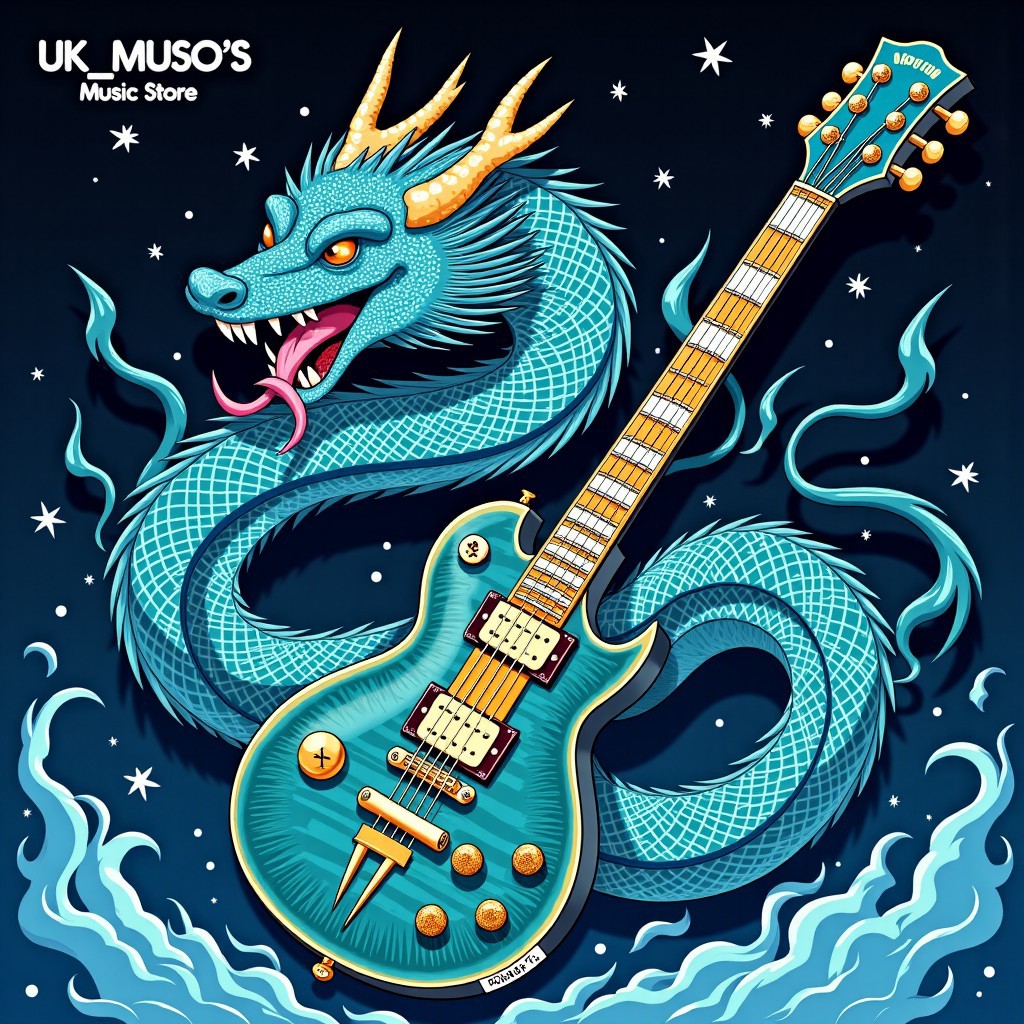 and its eyes are glowing, a majestic, forked tongue hangs out., featuring a stylized dragon. The dragon is depicted in sinuous, flowing, wavy patterns. Its body is a royal blue and emerald green colour, modern illustration style and, ethereal appearance. She has long, wrapped gracefully around the neck of a Gibson Les Paul electric guitar. The text "UK_MUSO'S Music Store" is written across the top of the image