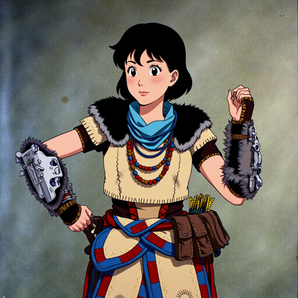 1980s anime screencap, a woman with short black hair wearing layered Nora outfit shirt, Nora outfit fur accents, Nora outfit bead necklaces, Nora outfit skirt panels, Nora outfit red sash, Nora outfit pants, Nora outfit hip quiver, Nora outfit blue scarf, Nora outfit leg guards, Nora outfit arm braces, Nora outfit belt with pouches, and Nora outfit fur boots