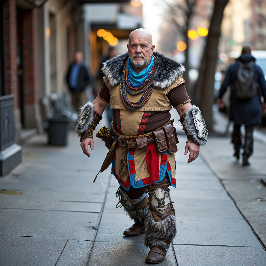 photo, an old ugly fat bald man wearing layered Nora outfit shirt, Nora outfit fur accents, Nora outfit bead necklaces, Nora outfit skirt panels, Nora outfit red sash, Nora outfit pants, Nora outfit hip quiver, Nora outfit blue scarf, Nora outfit leg guards, Nora outfit arm braces, Nora outfit belt with pouches, and Nora outfit fur boots walking on a pedestrian walkway in new york city