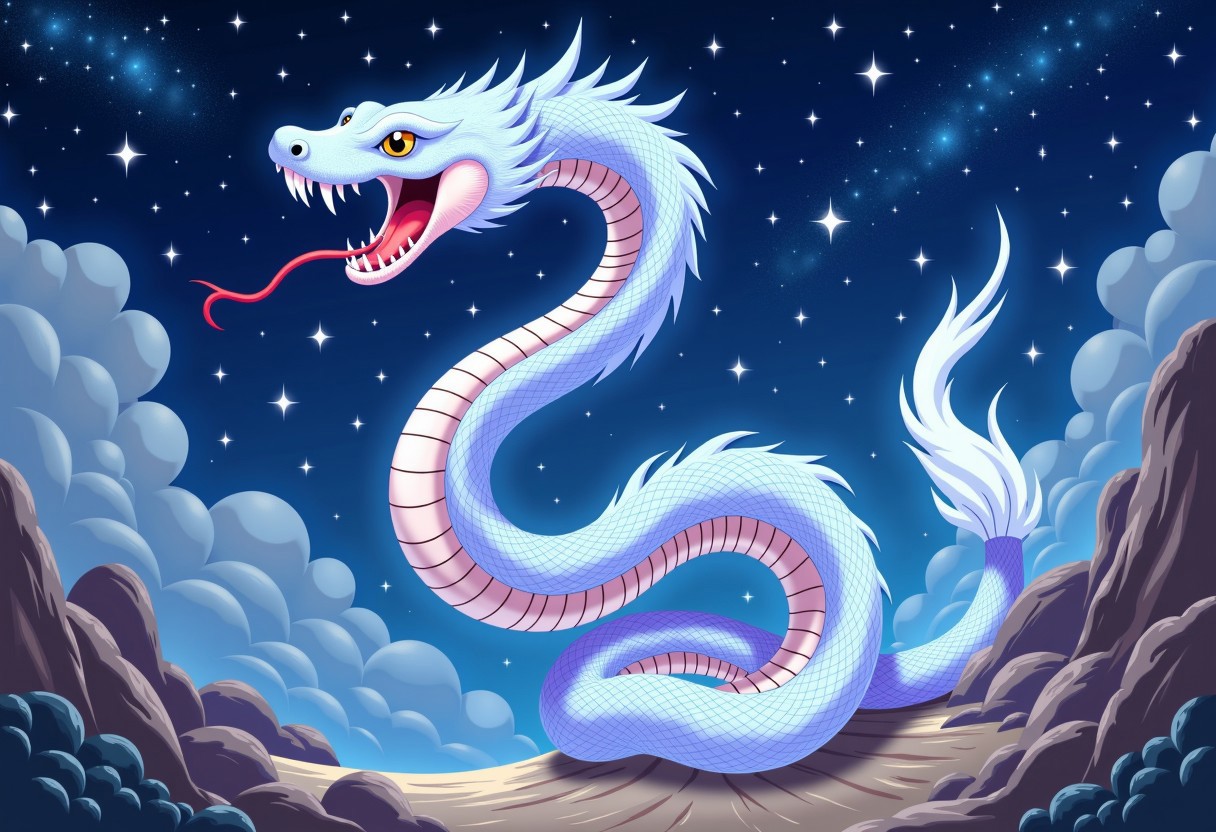 towering celestial snake, Snake glowing white teeth, star-shaped snake hair, flowing comet-like tail, radiant wings, night sky, starlight aura, fantasy, solo focus, divine, Year of the Snake vibes