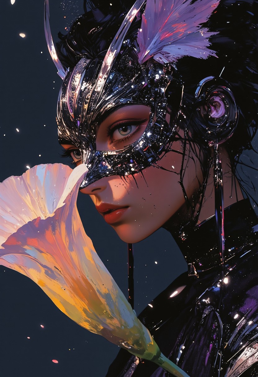 A hyper-realistic close-up portrait of a young woman wearing an elegant, avant-garde symmetrical mask crafted from intricately woven netting, this time with shimmering dark purple accents and scattered glitters that catch the light. The mask is beautifully outlined with delicate, silver embroidery, adding a refined touch. A striking calla lily partially obscures her face, its petals a rich blend of deep purple and creamy white, creating a dramatic contrast with the mask. Shot from a low angle to capture her intense expression, the composition highlights the detailed textures of the mask and flower, all enhanced by dramatic side lighting that plays off the glimmering accents, casting subtle sparkles for added depth and dimension.