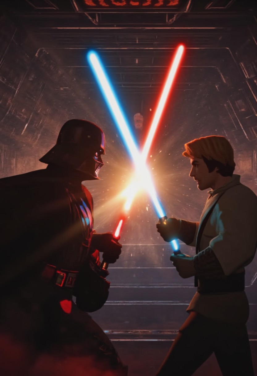 battle scene where two lightsaber wielding characters clash their lightsabers against each other. Darth Vader and Luke Skywalker face off in the Carbonite chamber of Cloud City, moody lighting orange lighting is juxtaposed by a cold smoky background. The two, brandishing their lightsabers. The blade Vader holds glows red, and the one Luke holds glows blue.
