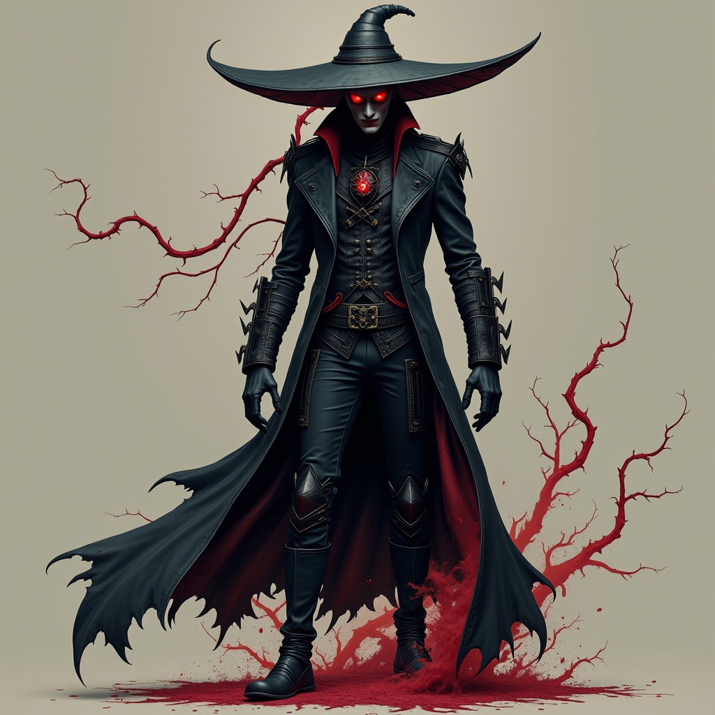 A dark, stylized figure stands confidently, wearing a large, wide-brimmed hat. A long, dark coat with intricate designs flows down to the feet, featuring various textures and patterns. The coat is complemented by sharp, angular details and is worn over a fitted outfit and red accents throughout its attire. The figure has very pale skin. Dark, flowing tendrils and splashes of red surround the figure, creating an ominous atmosphere. Red flamed eyes
