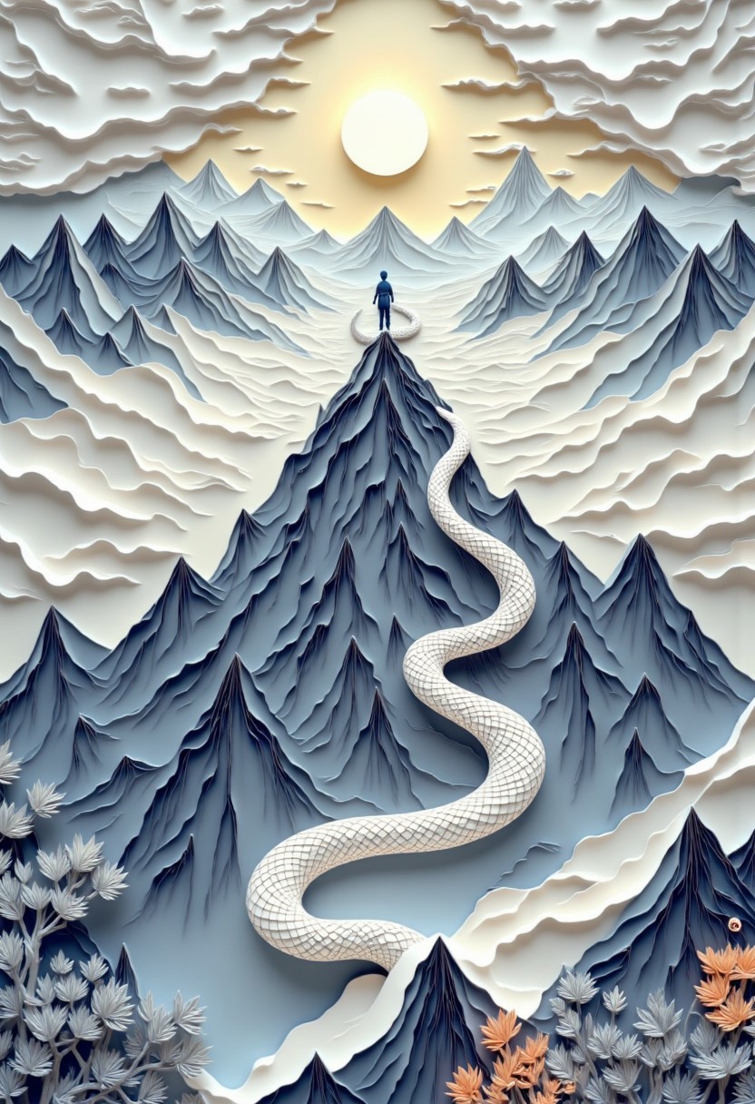 Hyper-detailed paper quilling artwork of a majestic snake dragon standing proudly atop the highest mountain peak, surrounded by a sea of clouds. Intricate paper strips meticulously crafted reveal the snake dragon strong silhouette, textured scales, and curling horns with three-dimensional depth. Composition elements: snake dragon positioned prominently at the summit, gazing into the horizon. Precision-cut paper strips in shades of grey and white forming jagged mountain terrain. Swirling white paper filigree representing soft clouds enveloping the peak. Subtle light rays breaking through the clouds, creating a serene atmosphere. Distant mountain ranges layered in the background for depth. Small quilled details like alpine grass and wildflowers clinging to rocky surfaces. Technical specifications: Ultra-high resolution: 16k Photorealistic paper sculpture technique Dimensional layering for profound depth Soft shadowing enhancing three-dimensional effects Natural color palette inspired by mountainous landscapes Archival-quality paper for durability Macro detail rendering highlighting intricate textures Cinematic lighting illuminating the snake dragon and peak Subtle depth of field focusing on key elements aidmaimageupgrader