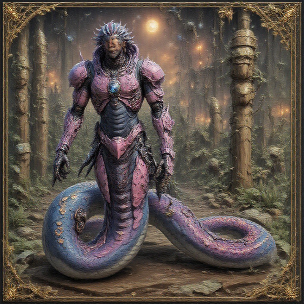 bio-mechanical, completely covered, dressed in mechanical armor, a solo androgynous_character, android, led eyes, multicolored hair, gradient hair, multicolored scales, rainbow scales, anthropomorphic snake (naga), (on a tarot card-like design) Rating: general, (Styles: vaporwave, sythwave, Cityscape), 8k, colourful, Masterpiece, cyberpunk style