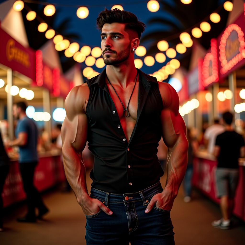 a full length photo of a handsome very short very lean bodybuilder man who is wearing a sleeveless black shirt that is unbuttoned, showing his massive pecs and deep cleavage and he has a deep tan and glossy skin and medium ength black hair and glowing red eyes and earrings and he has a narrow waist and narrow hips and a narrow pretty-boy face and is wearing dark blue jeans and is standing in the middle of a haunted carnival at night and he has a huge bulge in his crotch
