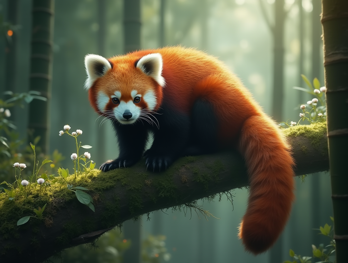 A hyper-realistic, majestic red panda perched on a moss-covered branch in a lush, misty Chinese rainforest. The vibrant orange and white fur of the panda glows softly under dappled sunlight filtering through the dense canopy of ancient, towering bamboo trees. Ethereal touches of glowing flora surround the scene—delicate, bioluminescent flowers and soft green moss emit a magical glow in the shadowed undergrowth. The red panda's expressive eyes shine with intelligence and curiosity as it peers down at its surroundings. Its lush, bushy tail drapes gracefully over the branch, adding a dynamic element to the composition. In the background, hints of mystical forest spirits, faintly visible as shimmering translucent figures, weave through the foliage, adding an enchanting atmosphere. The cinematic composition captures sharp details of the red panda's fur, the textured bark of the branch, and the soft interplay of sunlight and shadows, creating a vibrant and magical masterpiece. The photo is ultra-HD with incredible clarity, capturing the detailed textures and colors of this serene yet otherworldly scene. Keywords: Red panda, Chinese rainforest, glowing flora, ethereal, cinematic, ultra-detailed, vibrant colors, magical atmosphere, atmospheric lighting, sharp textures, bioluminescence, forest spirits, moss, bamboo trees, masterpiece, 32k, ultra HD.