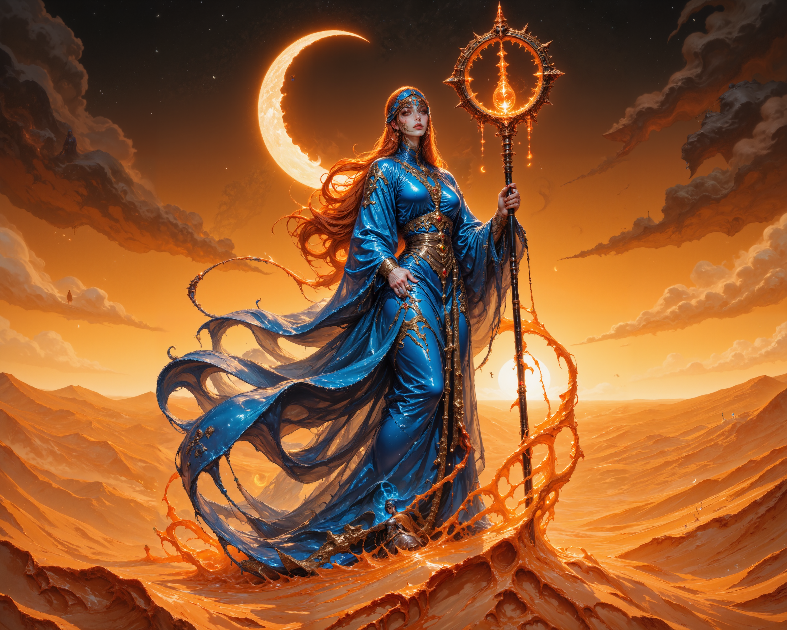 A mystic desert nomad stands atop wind-carved dunes, her flowing azure robes billowing like waves in the sunset glow. Intricate golden patterns trace across her fabrics, shimmering with enchanted light. Her eyes are hidden beneath a jeweled headscarf, leaving only a fiery, determined gaze visible. She wields a tall staff carved from ancient obsidian, with a glowing crystal orb at its tip illuminating her path. A swirling sandstorm encases her figure, yet parts around her as if guided by her presence. Above, a crescent moon rises against an amber sky, scattered with glimmers of starlight. The scene displays ethereal light harmony, capturing the mystical essence of a desert sage, detailed with ultra-realistic quality and cinematic focus, evoking a sense of mystical solitude and power. <lora:FluxMythAn1meL1nes:0.9> <lora:Liquid_Clothes_v2:0.9> <lora:Comic book V2:0.2> <lora:It's a LoRA for portraits, BUT! actually specialized in backgrounds. v1.0:0.7> <lora:flux_dev:1>