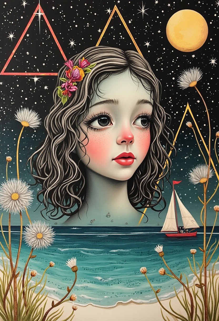 stars white dandelions triangles neon moon turquoise sea shore white sand ship sailing wavy lines geometric shapes red-black-yellow-green colours girl's face psychedelic black and white pencil monochronism 3d professional photo surrealism Nicoleta Ceccoli.