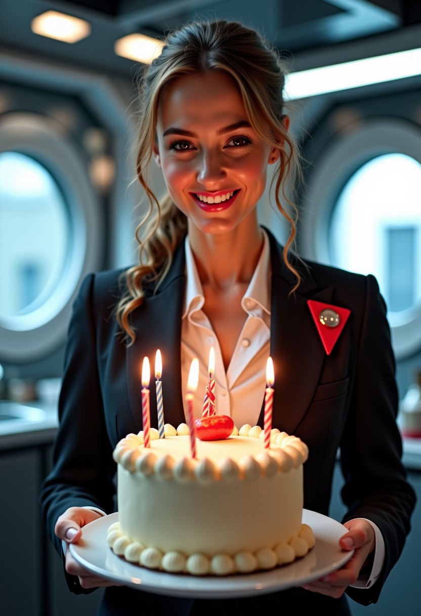 photo of a beautiful woman wearing a futuristic business suit, red pin on collar, holding a cake on a plate in a futuristic space kitchen, light smirk, warm and welcoming look, text among candles on cake says "happy buzz day!",