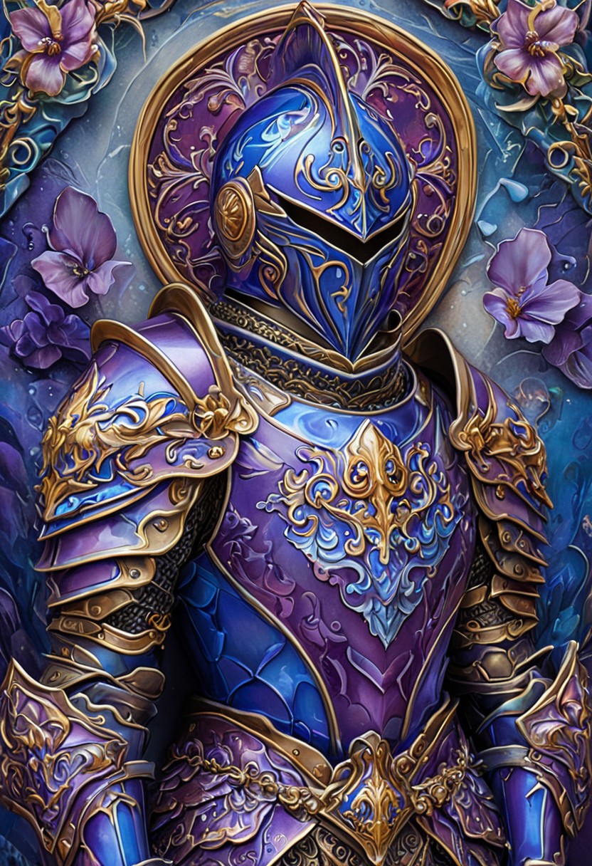 8k, score_9, score_8_up, score_7_up, masterpiece,Anime style,ultra detailed, vibrant colors, novuschroma54 style, 1boy,knight, Armor, helmet, full armor, ornamental armor, luxurious armor, Religious background, iris motif, blue and purple theme,