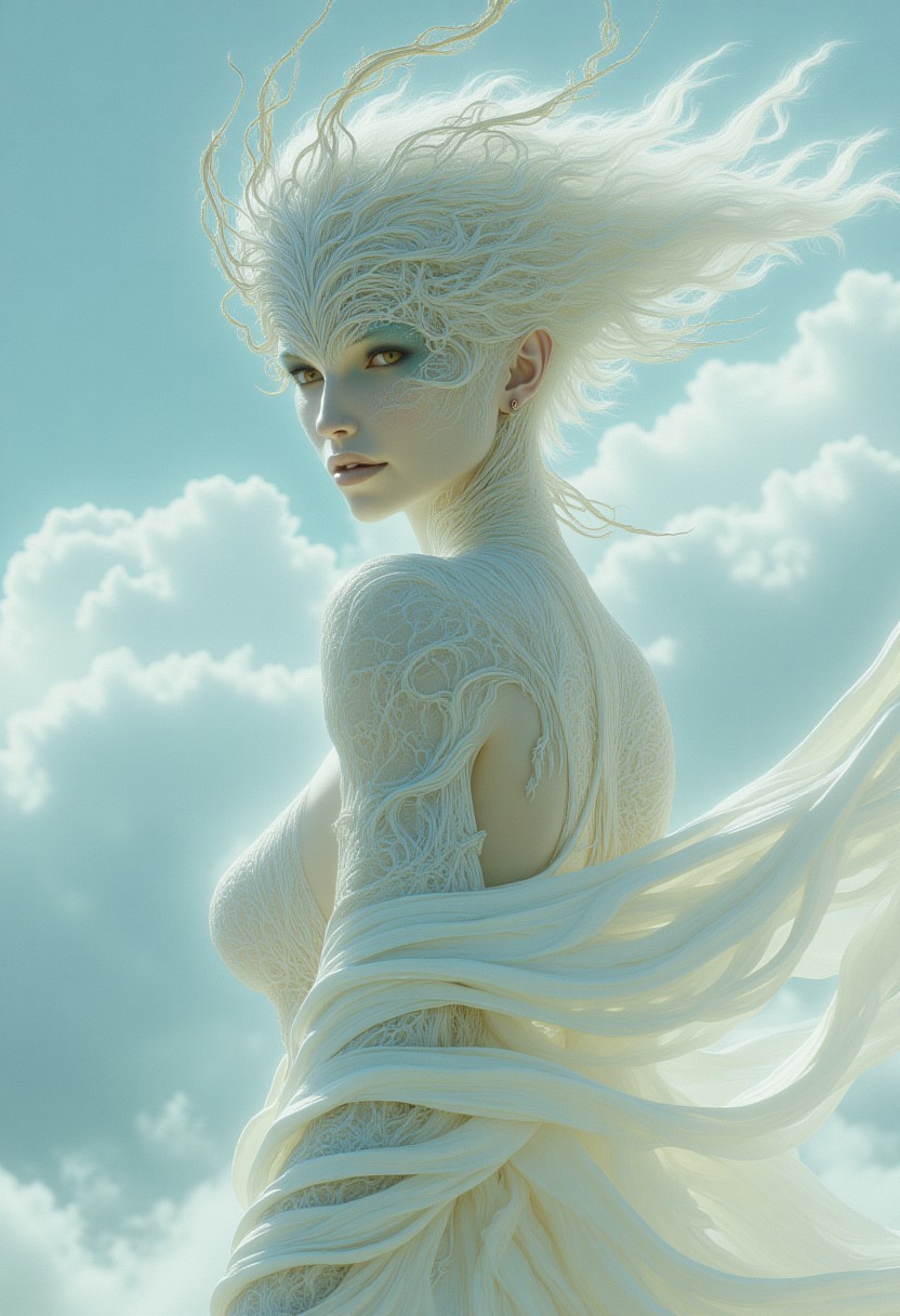 This artwork portrays a captivating female tree nymph with a soft, ethereal glow, standing against a bright, minimalist sky backdrop that exudes calm serenity. Her form is adorned in a delicately crafted ensemble, consisting of a light, translucent outfit in pale ivory hues. The design appears organic and nature-inspired, with delicate tendrils that resemble leaves or vines winding along the edges of her attire, further enhancing the ethereal aesthetic. Her toned physique is softly lit, the subtle play of light and shadow emphasizing her busty curves and athletic elegance and her light blue, spotted skin. The top is a unique take on a see-through minimal bra-like garment, held up by graceful, vine-like straps that frame her shoulders. The lower half of her ensemble flows in a sheer fabric, accentuated by carefully tied cords that create a sense of fluidity and weightlessness, as though she is part of the natural world around her. The subject's expression holds a quiet intensity. Her amber eyes meet the viewer with both curiosity and a hint of challenge, while her dark blue, slightly parted lips suggest a contemplative mood. Her short, layered hair frames her face in a simple, yet striking manner, and small feather-like details dangle near her neck and shoulders, lending a whimsical touch. The background is a clean white and blue cloudy softness mirrors the gentle purity of the subject, drawing attention to her as the central focal point.detailed