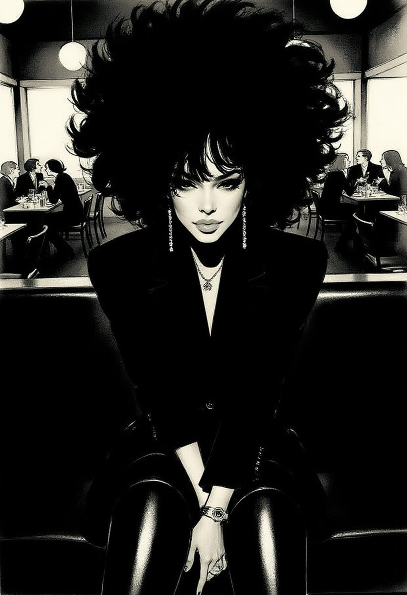 regr1 illustration. a black-haired black woman seated in a dimly-lit restaurant. She is dressed in a dark-colored jacket and faux-leather leggings, his hands resting on her lap. The woman's face is adorned with a afro hairdo, adding a pop of color to the otherwise monochromatic scene. The restaurant is filled with people, their tables and chairs visible in the background. <lora:regr3_shoujo_nocap_d6a3:1.0><lora:808055735763155314:0>