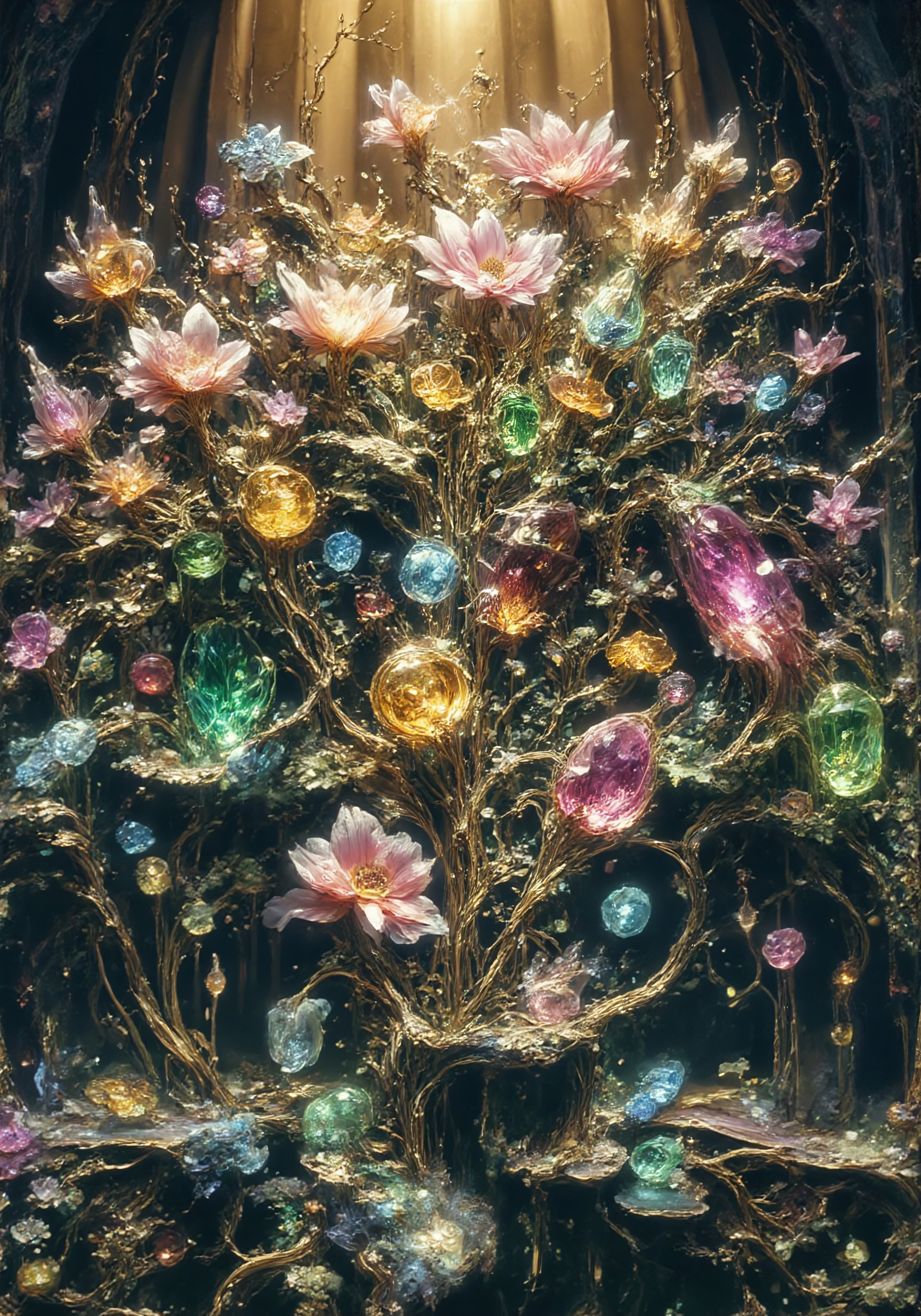 Ultra-realistic 8K macro photography, Octane render, Unreal Engine 5 masterpiece, dark academia meets Baroque jewelry design, floating terrarium containing: gold-rimmed rubies with fractal light refraction, sapphires embedded in emerald pedestals (photon lattice substructure), exquisite peonies with diamond-veined petals (hyperdetailed gemstone epidermis), orchids with crystalline pollen sacs emitting prismatic mist, cascading wisteria vines coated in liquid platinum, spiral nebula stamens generating electromagnetic auroras, quantum-entangled petals exhibiting parallel reality overlaps, gilded vines with bioluminescent emerald sap channels, suspended antigravity golden pollen particles, vantablack cosmos with gravitational lensing warping gem facets, chrono-crystalline framework casting multidimensional shadows, volumetric caustics penetrating gemstone inclusions, neo-gothic filigree patterns blending Beksiński's surreal architecture with Haeckel's radiolaria designs, hyperdetailed subsurface scattering in gem-flower hybrids, temporal ripples causing multi-era floral blooms coexistence, trending on ArtStation with biodigitalpunk aesthetic --ar 16:9 --v 6.0 --no symmetry, human, cartoonish, flat colors