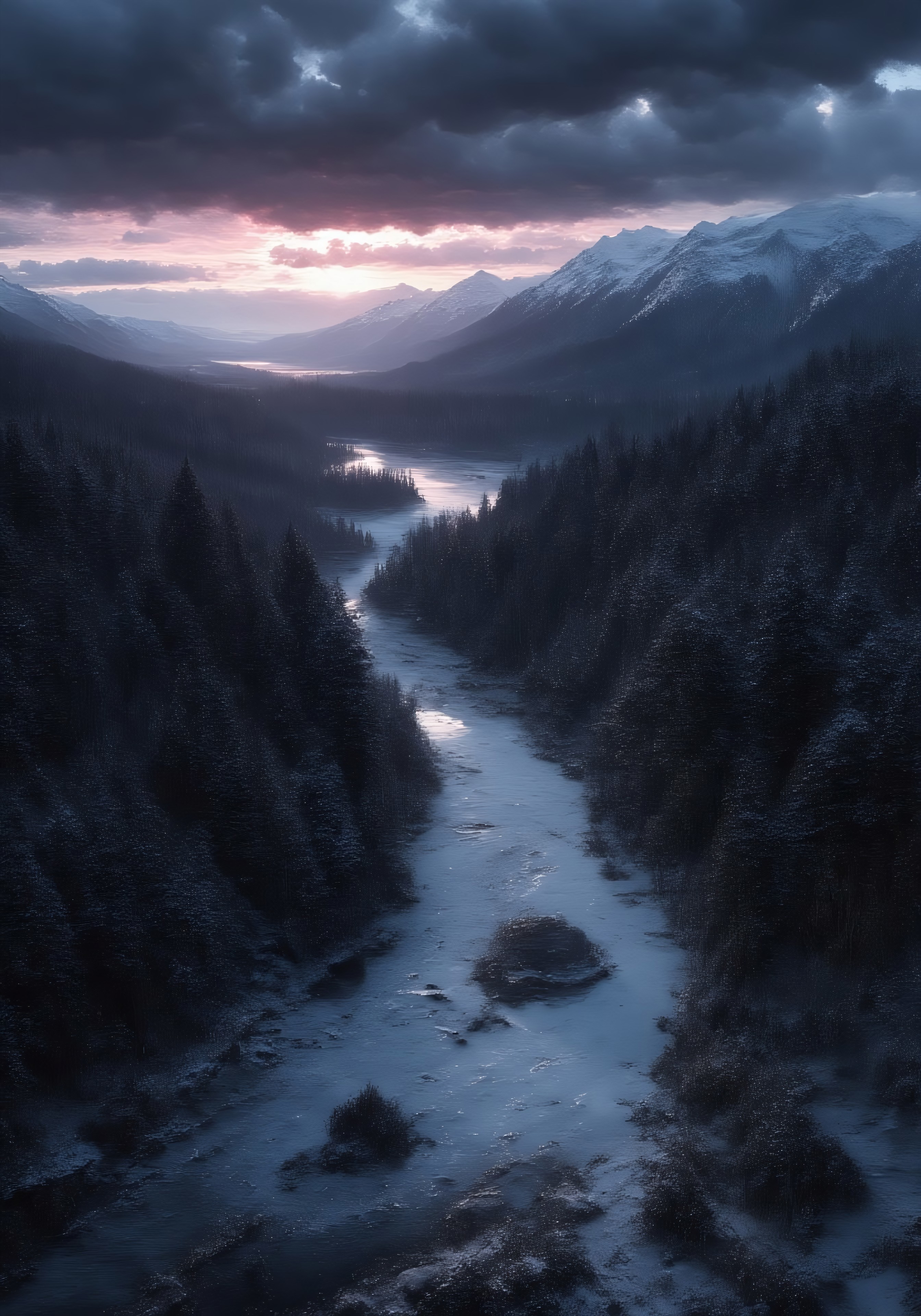 A sweeping, peaceful landscape of a view down a half-frozen river cutting through a pine forest, emptying into a lake. There is snow on the ground, a cabin on the lake's edge. On the other side of the lake are snow covered mountains. The tumultuous dark blue sky above is edged in the distance by a pink horizon of sunrise.
