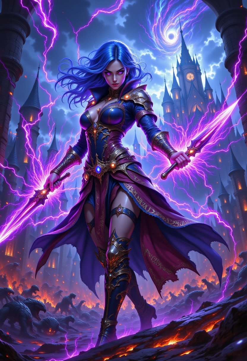 Smooth Quality - "A mesmerizing female demon hunter with ethereal blue hair and glowing violet eyes, summoning magical energy to banish a monstrous demon. She wears an intricately designed battle robe with glowing runes, and her dual blades shimmer with celestial light. Her expression is calm yet deadly, exuding confidence and power. The background showcases a battlefield of fallen creatures, with an ominous castle in the distance, adding to the epic fantasy atmosphere."