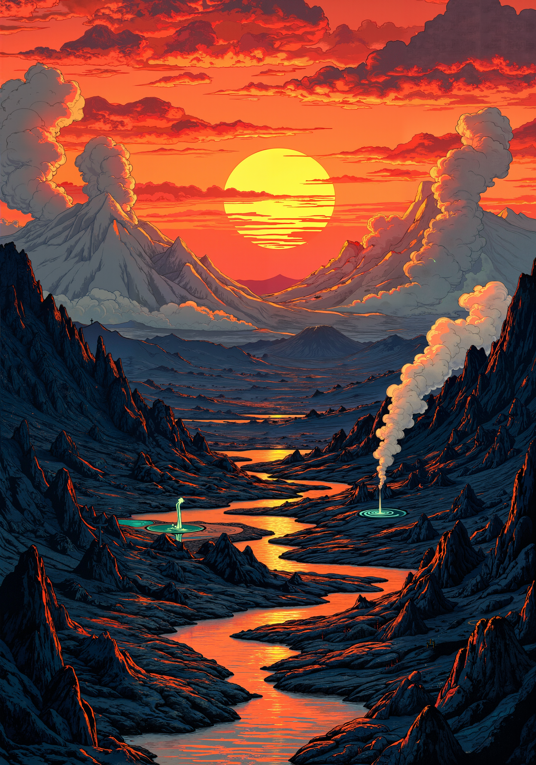 A volcanic plateau at sunset rendered in Japanese woodblock style, with stratified ash clouds creating chromatic bands of crimson, ochre, and sulfurous yellow. Steaming fumaroles disperse prismatic vapor through golden-hour rays, their angular light patterns echoing traditional kumiko latticework. Obsidian rock formations reflect molten-orange highlights against ultramarine shadows, while distant pyroclastic flows glow with ethereal bioluminescent blues. Delicate bokashi gradients transition from vermilion zenith to manganese-black horizon, punctuated by floating pumice particles catching spectral highlights. 8k ultra-detailed textures reveal hand-carved wood grain patterns in billowing steam columns, their swirling forms mirroring Edo-period wave motifs. Subtle tsubushi-zuri technique creates depth through layered transparent glazes, capturing the interaction of colliding thermal drafts. Celadon-green mineral deposits glow with subsurface scattering effects near geothermal pools, their mirrored surfaces fracturing the sunset into hexagonal aureoles. Traditional Shinto torii gates stand silhouetted in sumi-e ink blackness, their frames aligning with the setting sun's corona dispersion. Volcanic glass fragments create natural diffraction gratings, projecting miniature rainbows across weathered andesite surfaces. Ultra-high contrast enhances the interplay between incandescent gas plumes and deepening twilight indigo, evoking both primordial energy and sacred tranquility. <lora:Sinfully_Stylish_1.0_Flux:0.5> <lora:Niji B:0.2> <lora:flux_dev:1>