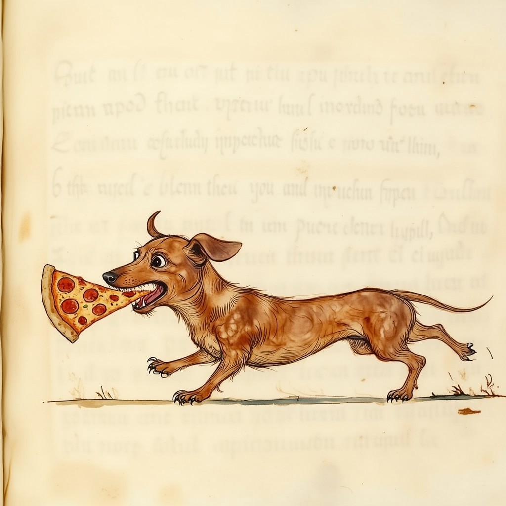 Illuminated manuscript illustration of a dachshund running away with a big slice of pizza in his mouth
