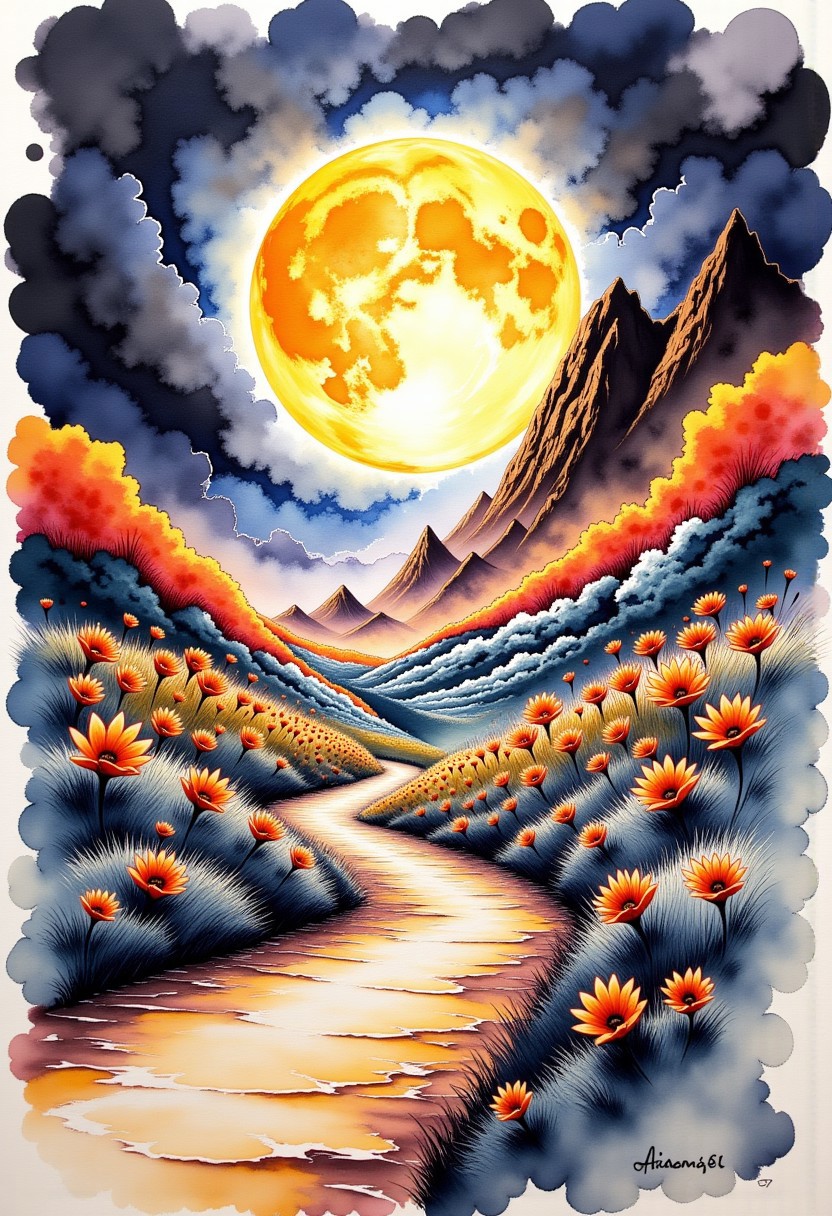 Beneath the cold moon’s gaze, dew-kissed and fragile, Tilt your neck, peer beyond—no path awaits. Blame clings to your skin, her shadow haunting, Yet you sit, love’s prisoner, in silent ache. Dew descends, pooling on your lap like silver tears, Chilling the heart within, numbing its fragile beat. The wine jars, once brimming with crimson secrets, Now stand empty, their intoxicating dreams drained. And as dawn tiptoes near, beauty awakens— A fragile dream, spun from moonlight’s threads. But beware, for within its delicate embrace, Tragedy stirs, waiting to shatter your fragile reverie. ink painting, ink art, splash, traditional media, colorful, scenery, very aesthetic, epic, majestic, fantasy art, dreamy, perspective, moody, magical, intricate details, highly detailed, ultra-detailed, absurdres, beautiful, painterly, detailed, textural, artistic, vivid, vibrant, aidmamj6.1, ink-painting,, ink wash,, ink wash painting,, white background,