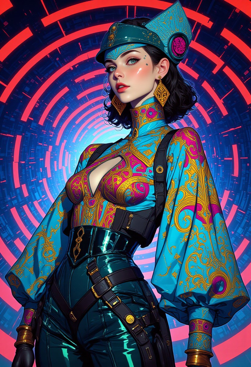 This image depicts a portrait-size hyper-realistic illustration, upper body focus, featuring a fierce cyberpunk woman set against a mesmerizing optical illusion background of deep sapphire blue and radiant crimson lines. These lines create an undulating wave effect, converging and diverging in rhythmic intervals to produce an illusion of infinite depth and movement. She wears avant-garde urban clothing with a futuristic edge, consisting of a structured, asymmetrical high-neck top with oversized sleeves, adorned with intricate Arabic patterns in a kaleidoscope of electric cyan, fuchsia, and gold. The shimmering fabric accentuates its ornate embroidery and geometric motifs. The voluminous sleeves extend past her hands, adding fluidity to her silhouette. She pairs this with tailored, high-waisted trousers in iridescent emerald green, cinched by a metallic indigo belt. Accessories include large gold-filigree hoop earrings and a sleek, angular visor partially concealing her eyes. The fusion of traditional Arabic elements with cutting-edge cyberpunk fashion creates a striking contrast, while the hypnotic background amplifies the visual tension, achieving a futuristic and avant-garde aesthetic. **8K, HD, HIGH RESOLUTION, MASTERPIECE, AWARD WINNING.** (anime, cyberpunk, BaroCybPnk, baroque, futuristic, anime art).
