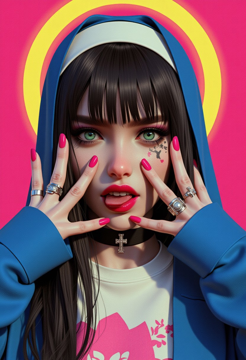 Niji_anime, highly detailed, semi-realistic anime style, anime aesthetic, cinematic lighting, ultra-detailed shading, dynamic composition. A young woman with a bold, punk-inspired aesthetic. She has fair skin, large expressive green eyes, and long, sleek black hair with blunt bangs. Her face is adorned with intricate tattoos, including floral designs, a heart, and a cross on her cheek, adding a rebellious charm. She wears a blue nun's habit, slightly pulled back to reveal a white t-shirt with a pink floral pattern and a cross symbol. Her tongue is playfully extended, showcasing a small stud piercing, exuding a mischievous energy. Her hands frame her face, fingers decorated with vibrant nail polish and multiple rings, enhancing her bold and stylish look. Her lips are painted a deep, glossy red, complementing her black choker with a silver cross pendant. The background is a striking fusion of vivid pink with a glowing yellow halo-like design, giving the image a surreal, playful yet edgy atmosphere. The color palette is bold and vibrant, with rich shading, cel-shaded highlights, and soft gradients, enhancing the anime aesthetic while maintaining semi-realistic depth. The blend of pop art inspiration with hyper-detailed anime styling makes for a visually striking composition, full of personality and attitude.